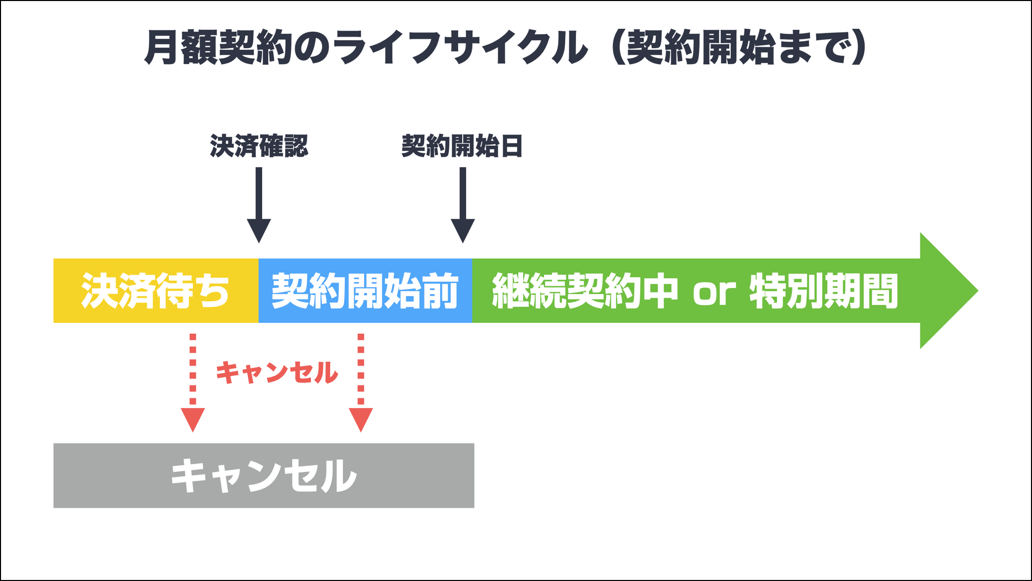 月額契約の契約開始までのライフサイクルは下図のようになります。契約は状況によって契約ステータスが変化します。