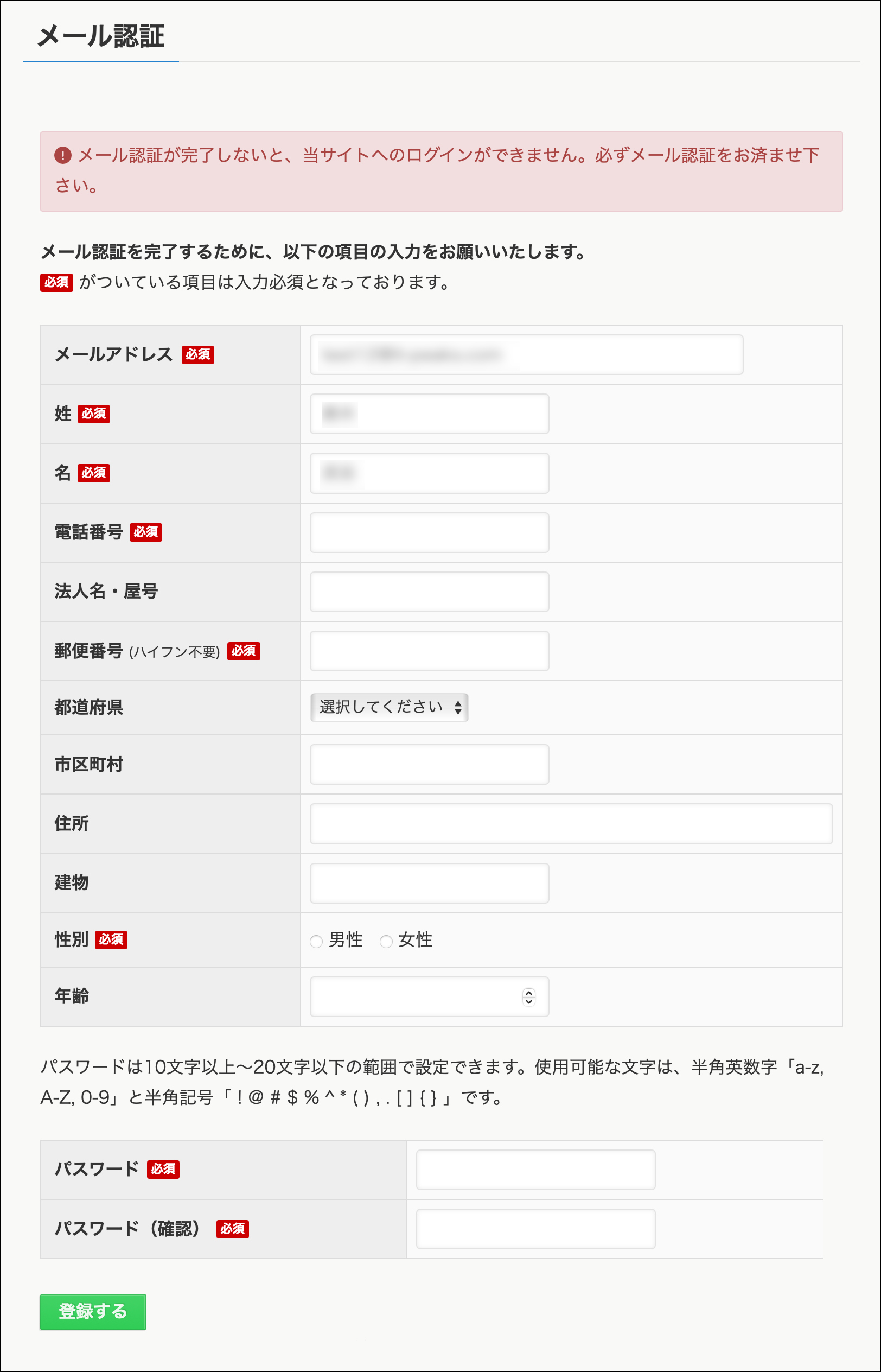 メール内の本登録をするボタンをクリックすると、以下のような本登録フォームが表示されます。以下の例ではメール認証と表示されていますが、Luxlinerの基本設定にて、以下の例のように、本登録以外の呼称に変更することが可能です。
