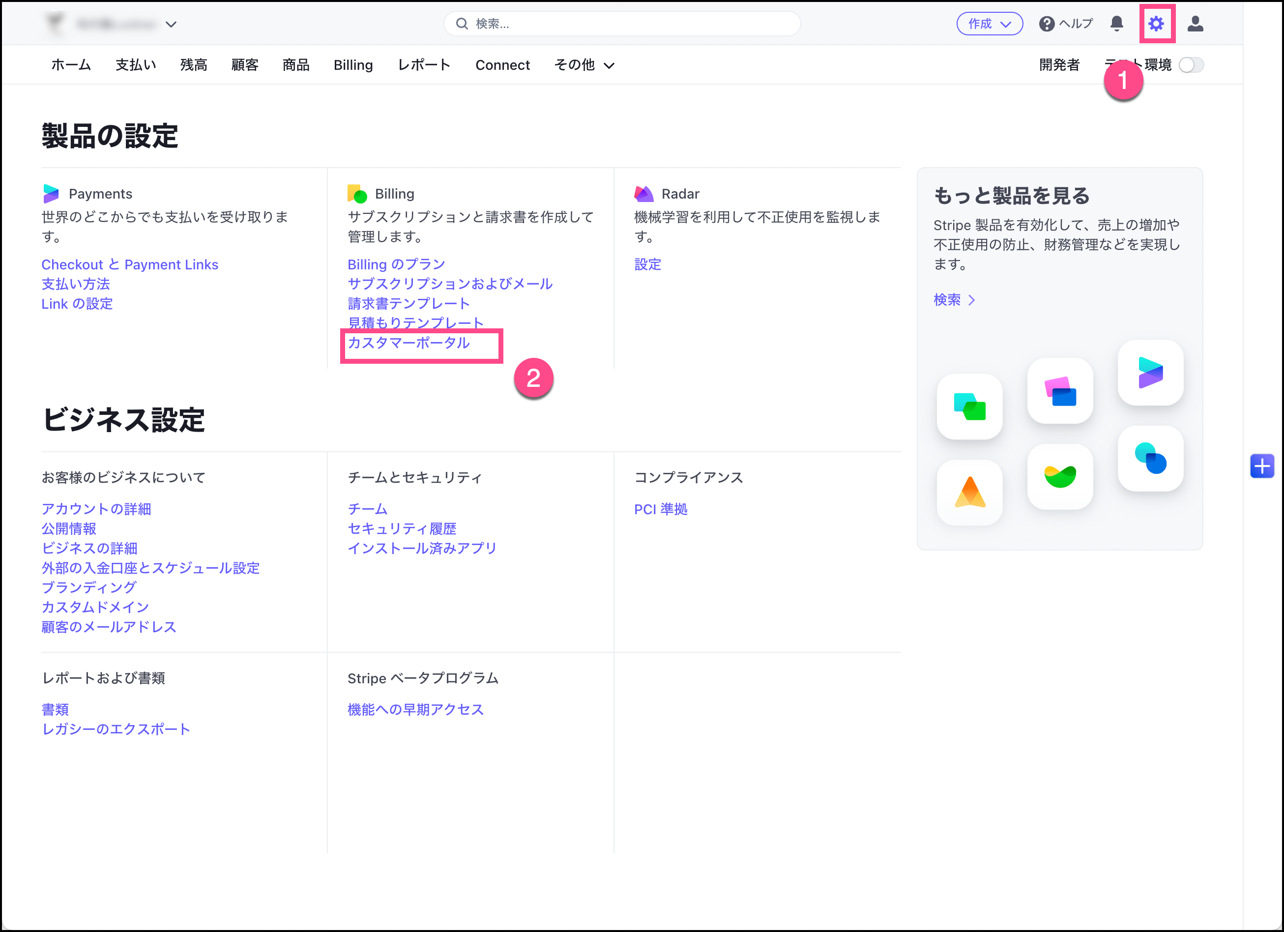 Stripeのダッシュボードにログインし、以下のようにカスタマーポータルの設定画面に入ります。