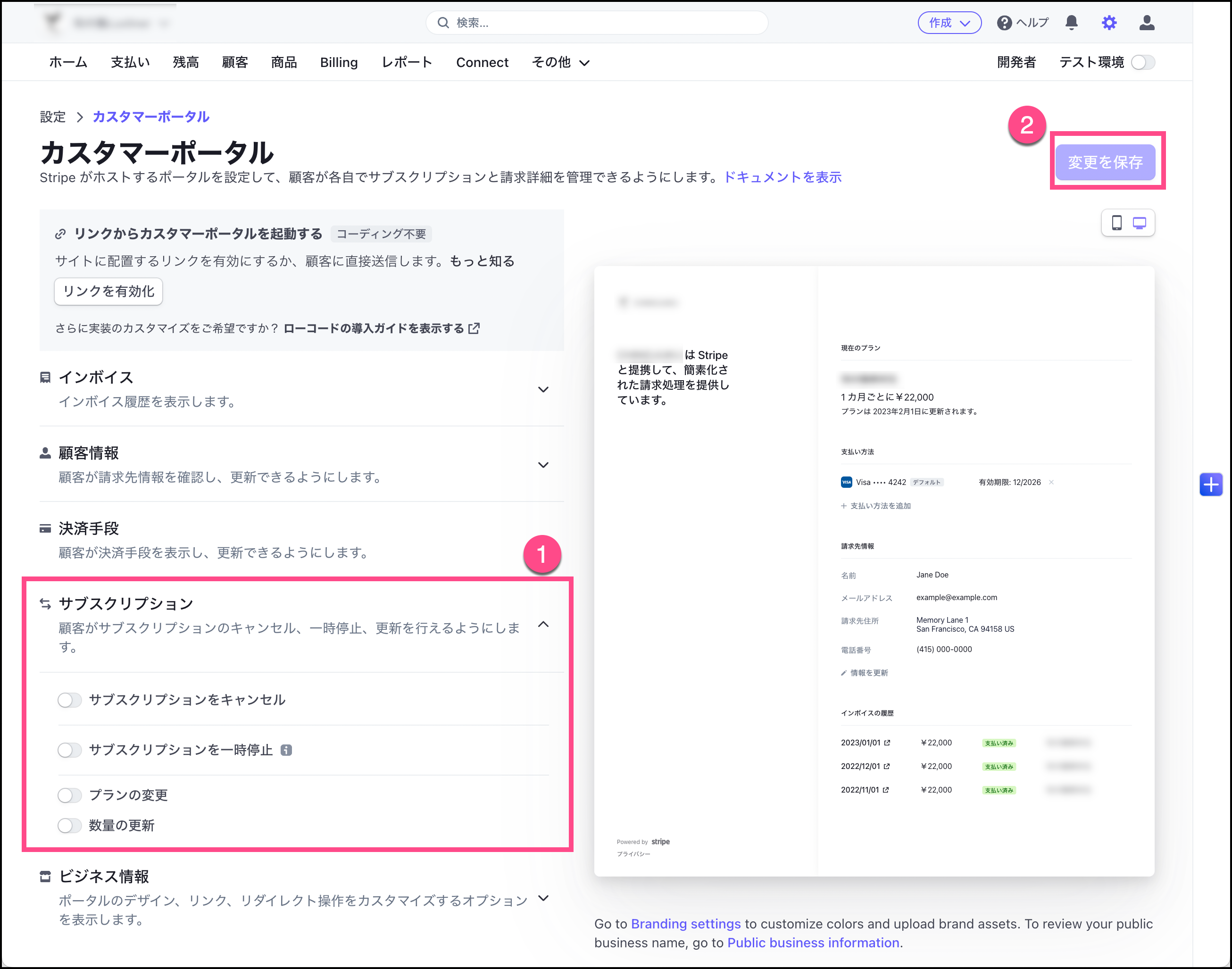 カスタマーポータルの各設定の詳細は、Stripeのドキュメントを参照してください。