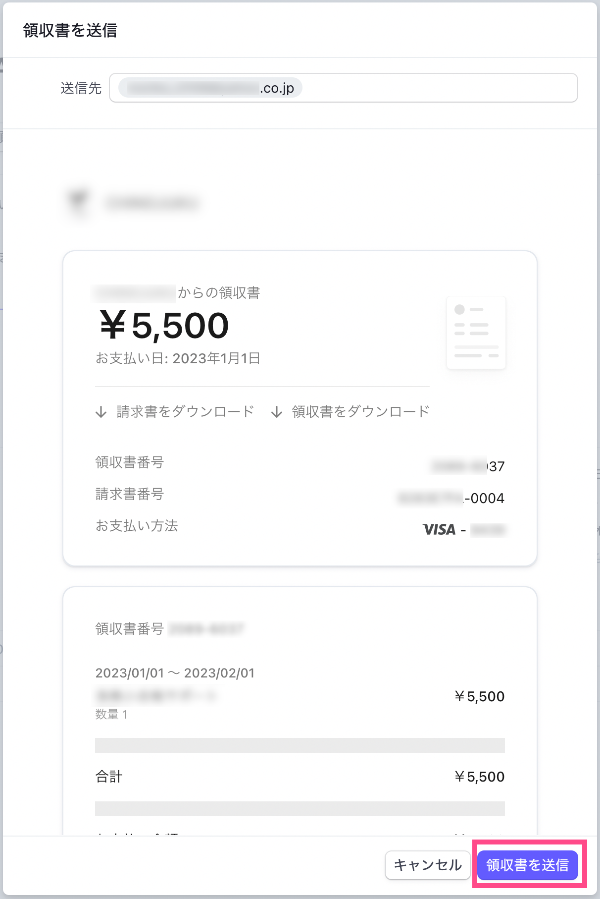 内容を確認して「領収書を送信」をクリックするとメールが送信されます。