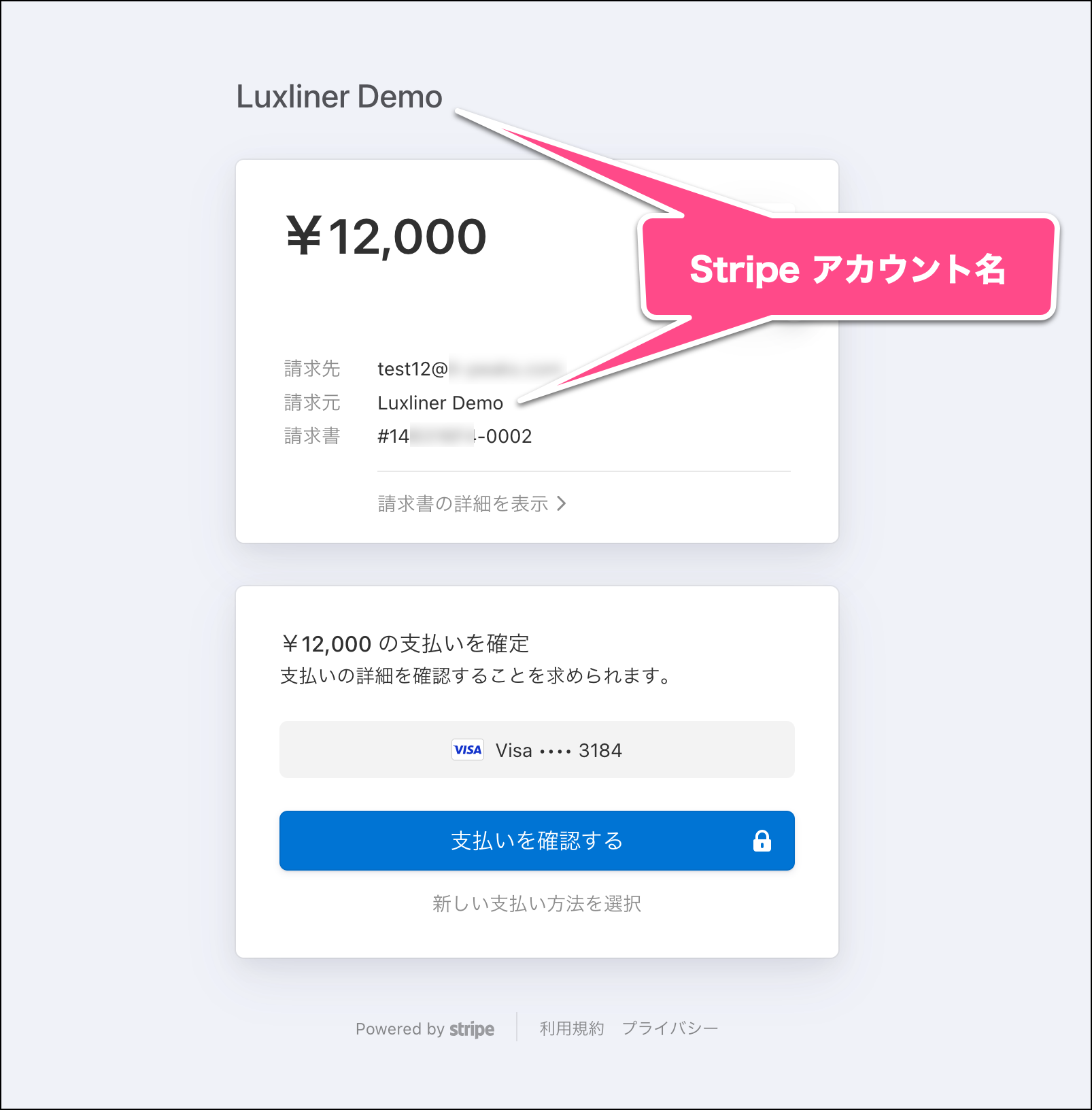 顧客がメール内のリンクをクリックすると、Stripeで用意された以下の画面で顧客は3DS認証を実施します。