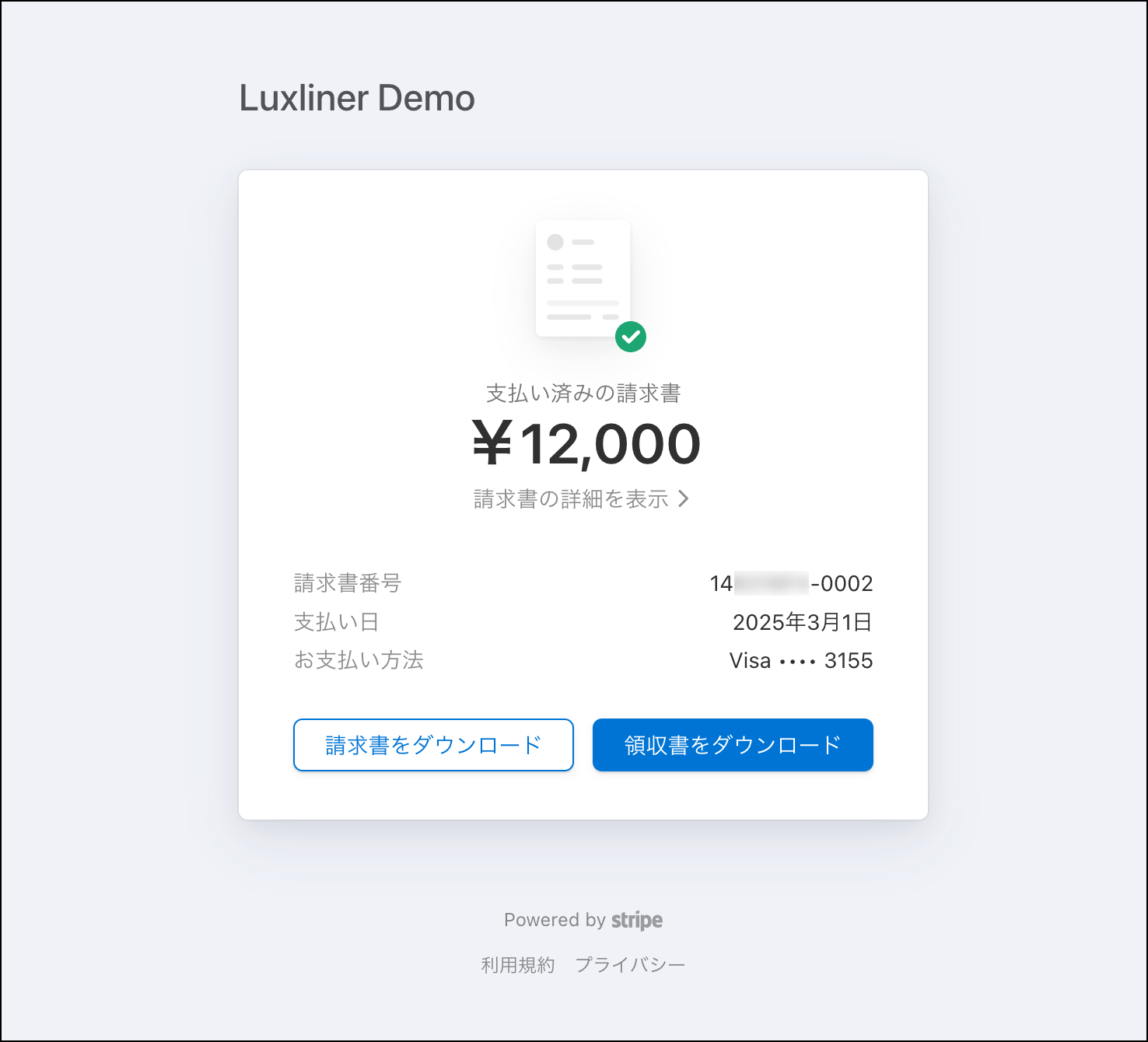 3DS認証に成功すると、リンク先の画面では以下のように支払済みの請求書として表示されます。