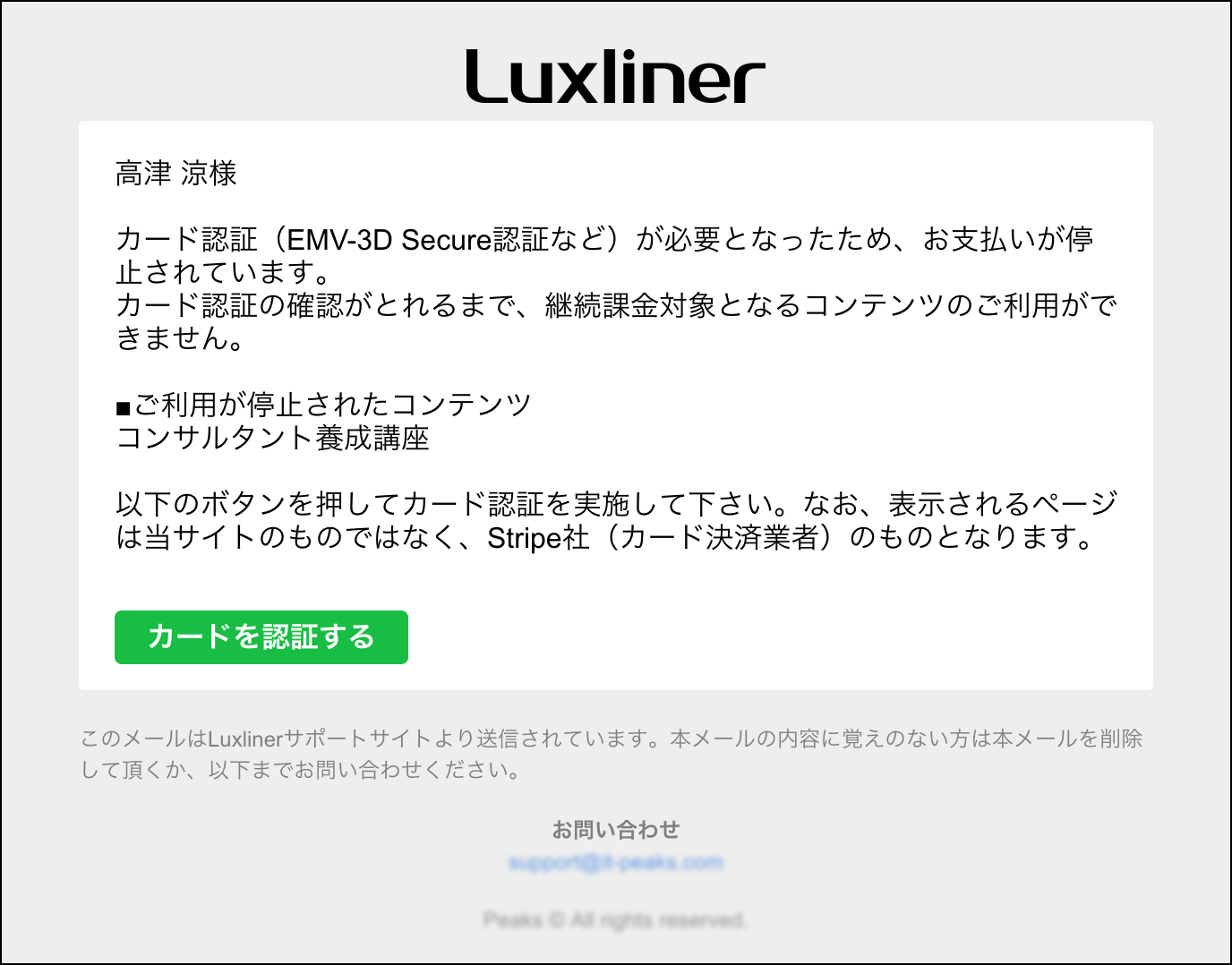 Luxlinerでは、3DS認証による決済失敗が発生してから、3日後、8日後、15日後に顧客に対してリマインドメールを送信するようになっています。認証が通ればリマインドは止まりますが、15日後以降はリマインドメールも送信されなくなりますのでご注意下さい。