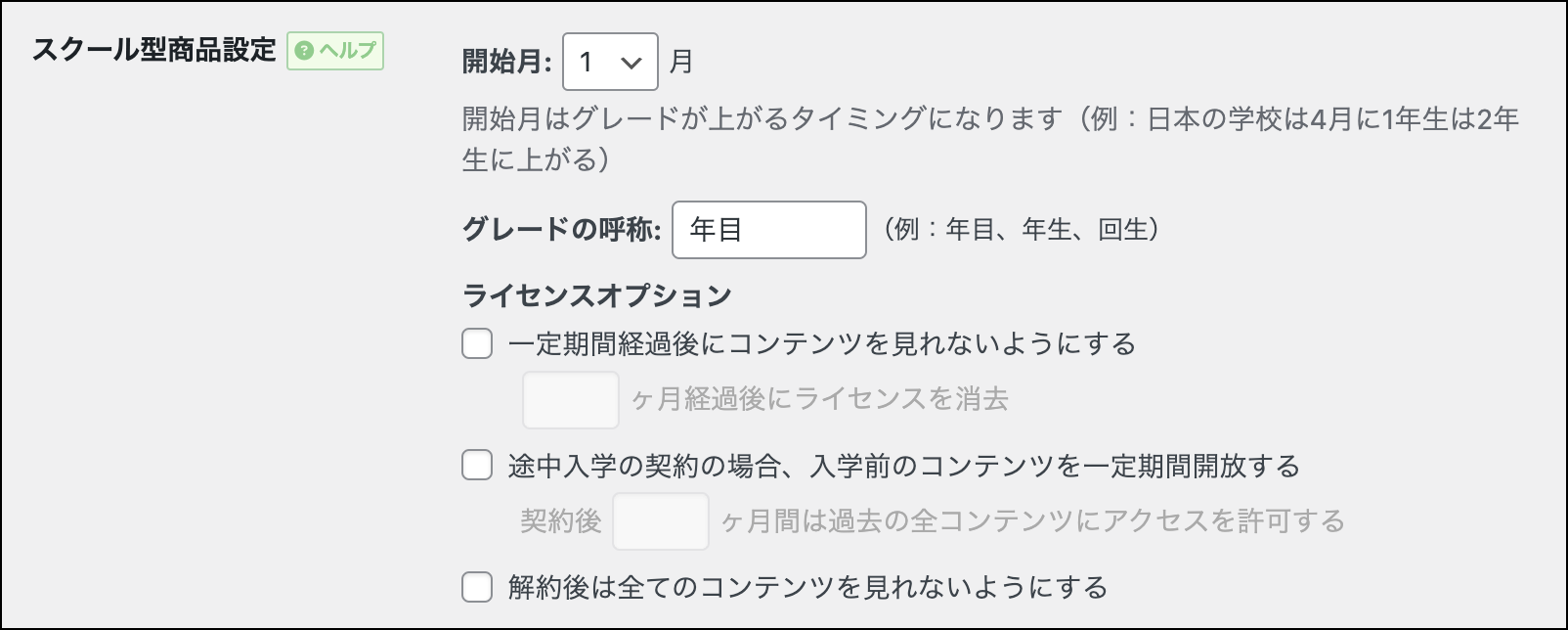 月額スクール方式は他の商品タイプと比べて特殊な運用となるため、以下のような特別な設定項目を設けています。