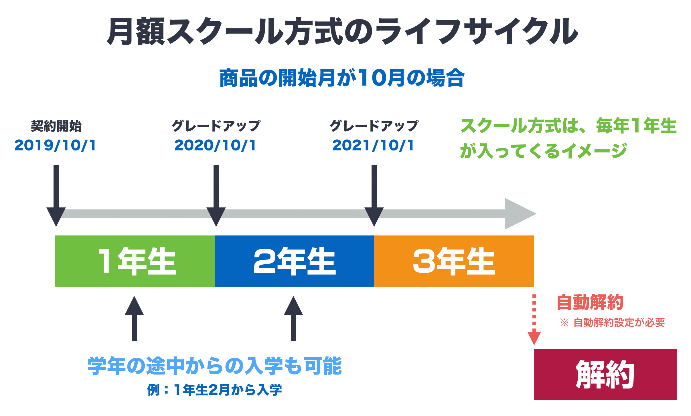 開始月とグレードの関係は、以下の月額スクール方式の商品の契約ライフサイクルの図を参考にしてください。