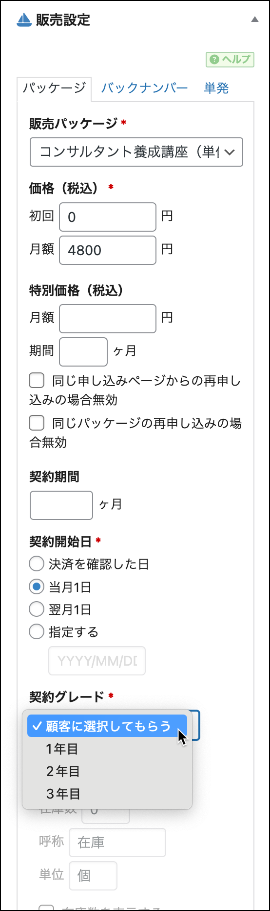 月額スクール方式では、下の画像のように、申し込みページの販売設定で契約グレードの設定をすることになります。