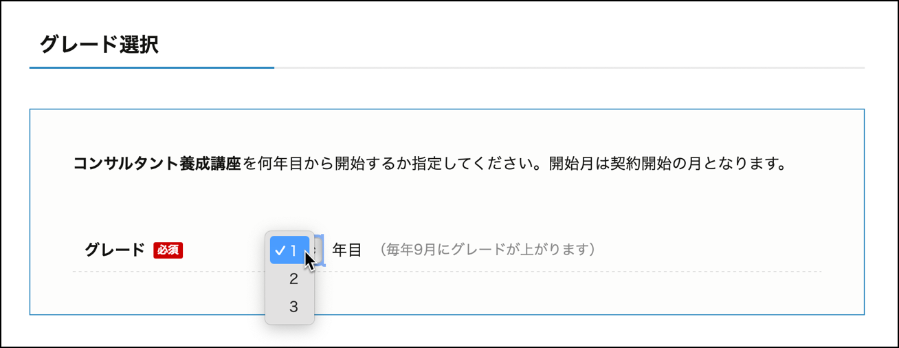 こちらを設定した場合は、以下のように申し込みページに、グレードを選択するドロップボックスが表示されるようになり、顧客自身がどのグレードから受講を開始するのかを選択できます。