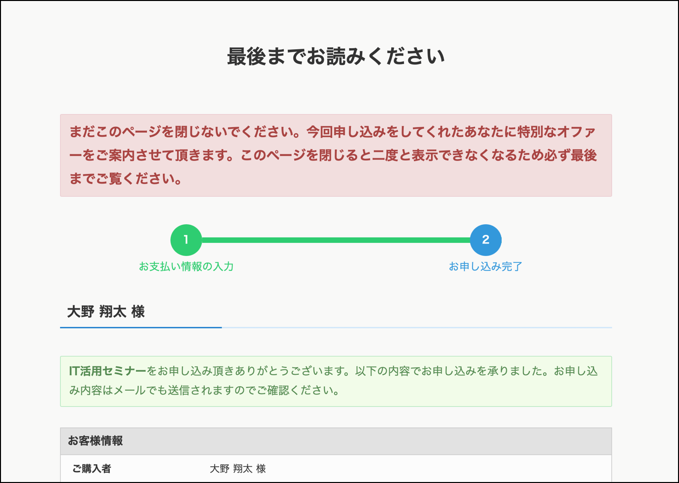 しかしワンタイムオファーがある場合は、申し込み完了画面の下にあるオファーを顧客に読んでもらうために、ワンタイムオファーがあることが明確にわかるように、タイトルとメッセージが表示されます。