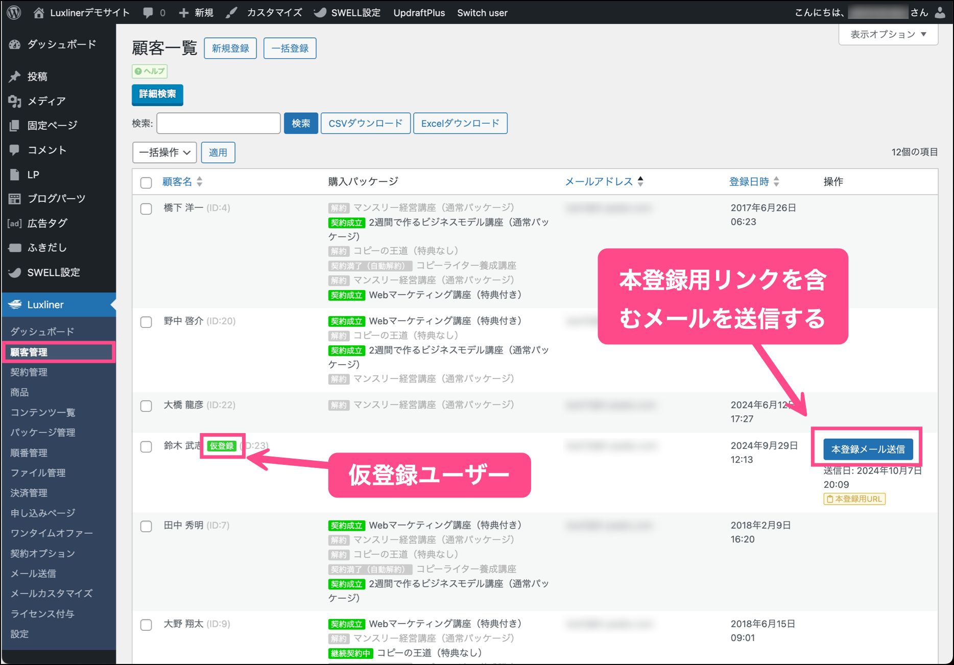 顧客名の後ろに仮登録のタグがついている顧客(会員)は、仮登録状態であることを表します。顧客が仮登録の場合は、操作の列に本登録メール送信ボタンが表示されます。