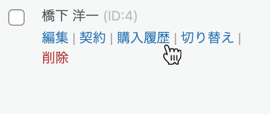 UserSwitchingプラグイン(サードパーティプラグイン)をインストールしている場合のみ表示されます。リンクをクリックすると、その顧客(会員)としてログインしている状態に切り替わります。顧客からの問い合わせ等で動作や状況などを確認する場合に便利ですが、ご利用には十分ご注意ください。