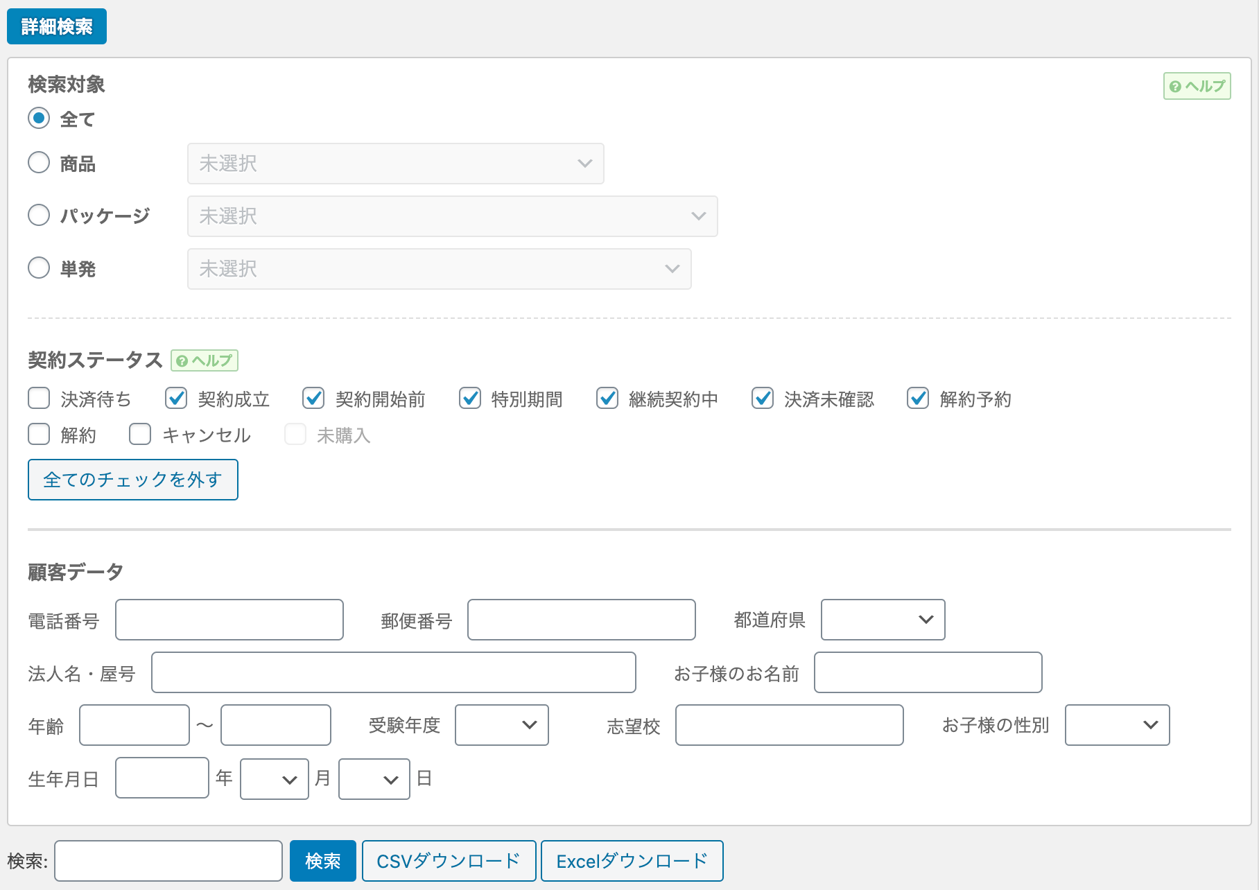 どのような契約状態の顧客(会員)を検索対象とするかは、すぐ下の契約ステータスで決定します。
