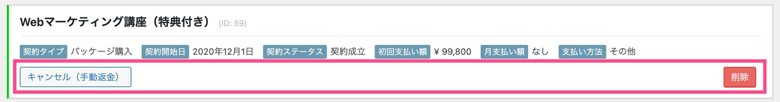 契約成立状態の契約をキャンセルします。銀行振込による申し込みであったり、管理者が手動で作成した契約であるため、返金は自動では行われません。