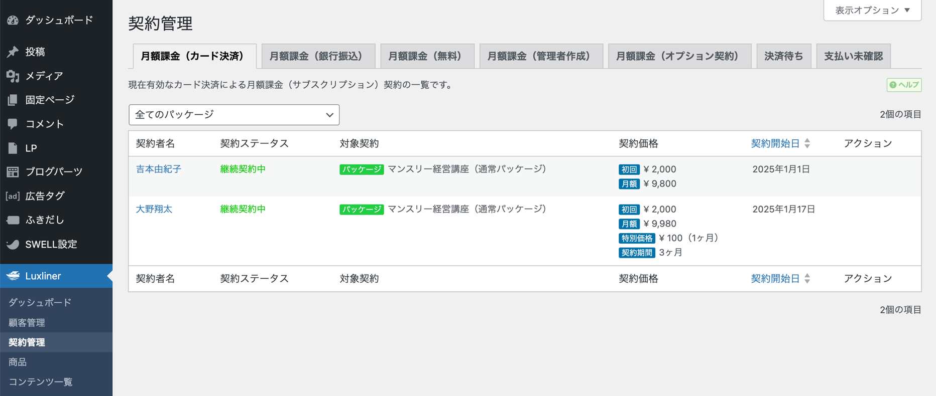 契約者の名前です。クリックすると顧客(会員)個人の契約管理画面に遷移します。