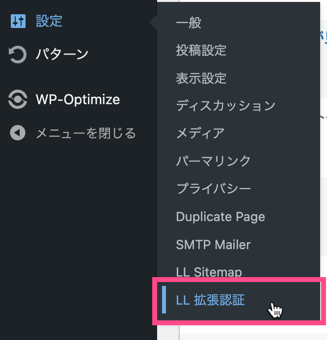 LL拡張認証の設定画面は、WordPress管理画面の「設定」→「LL拡張認証」からアクセスできます。
