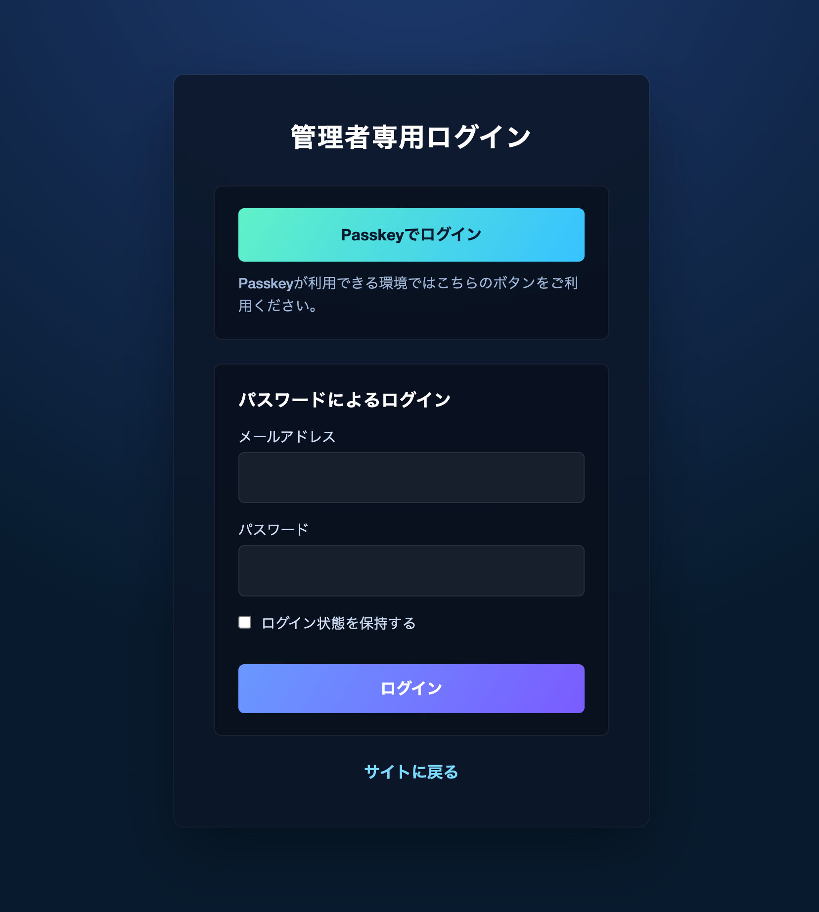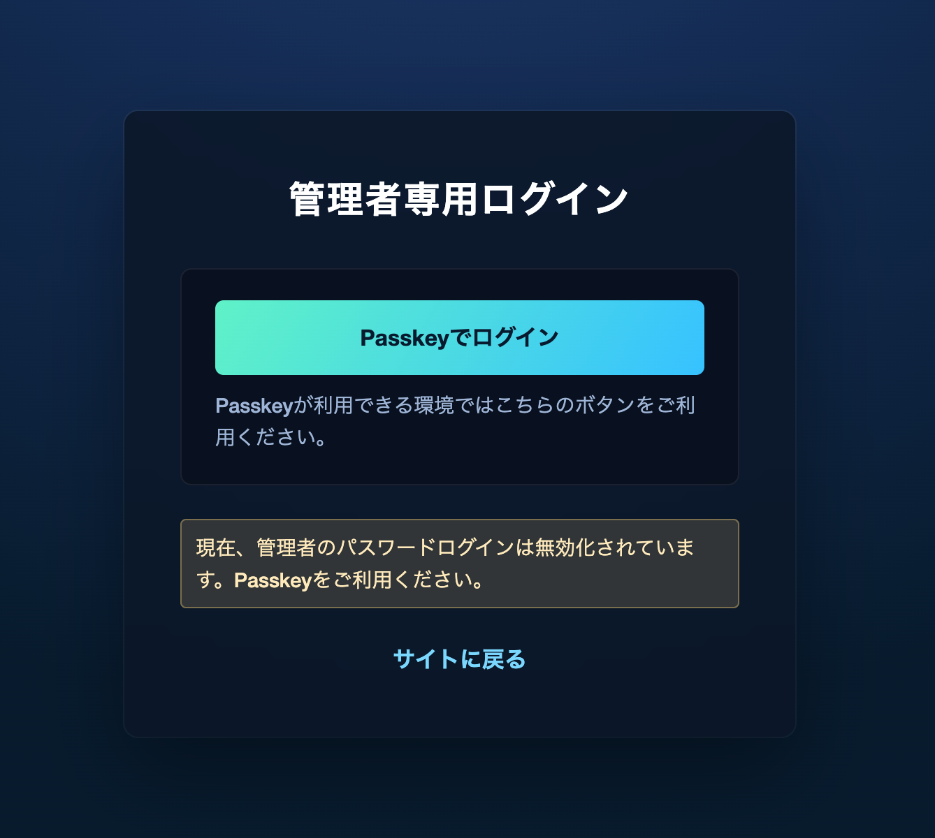 Passkey認証を有効にすると、以下のような管理者専用ログイン画面が設置されます。一般ユーザーの目に触れることは基本的にないため、デザインは固定です。
