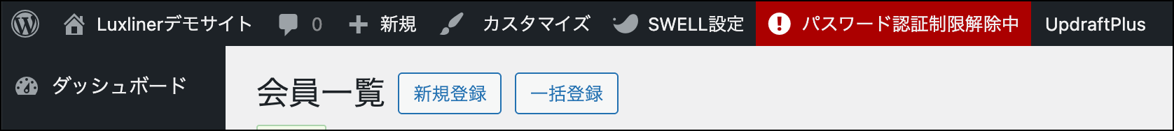 管理画面に入ると、上部のAdminbarに以下の画像のようにパスワード認証制限解除中という警告が表示されます。