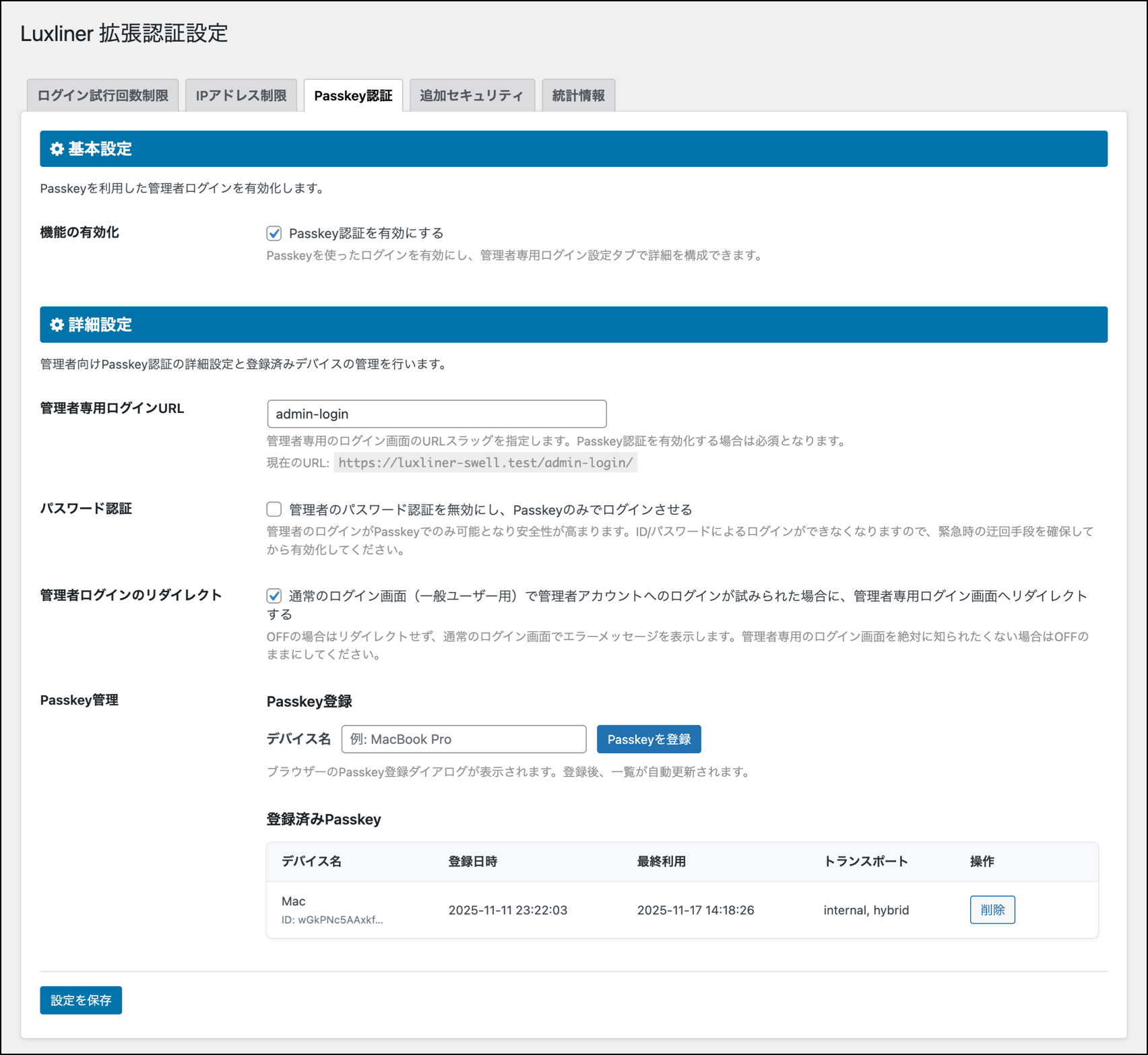 「Passkey認証を有効にする」にチェックを入れることで、管理者のログインにPasskeyが使えるようになります。