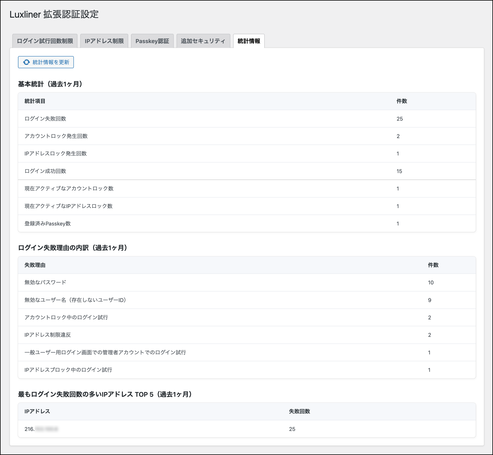 統計情報では、過去1ヶ月のログイン失敗回数などの簡易集計データ確認できます。あまりにもIPアドレスロックやアカウントロックなどが頻発する場合はこちらで確認してください。