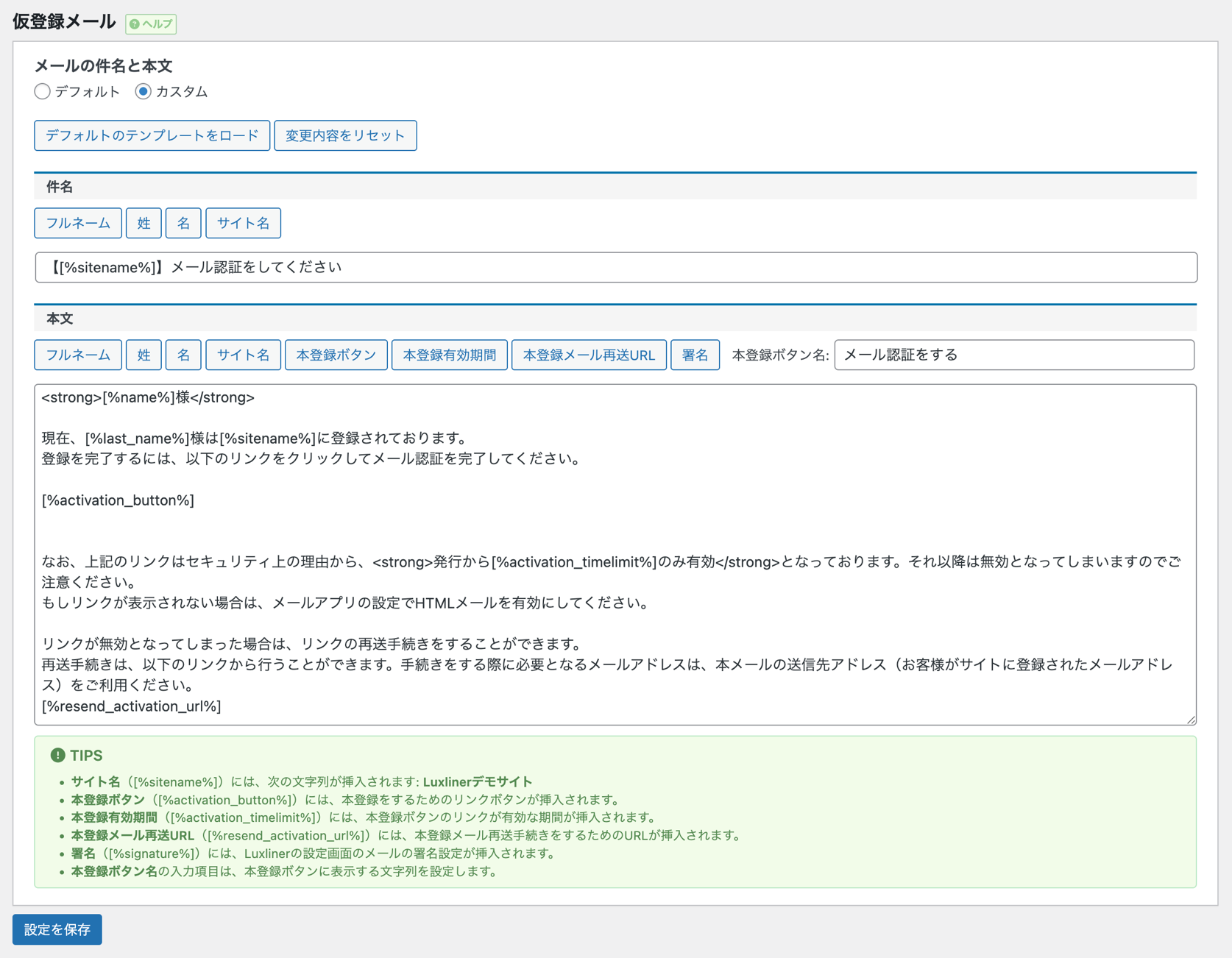 カスタムを選択した状態で、デフォルトのテンプレートをロードボタンをクリックすると、デフォルトの件名と文面がフォーム内にセットされます。
