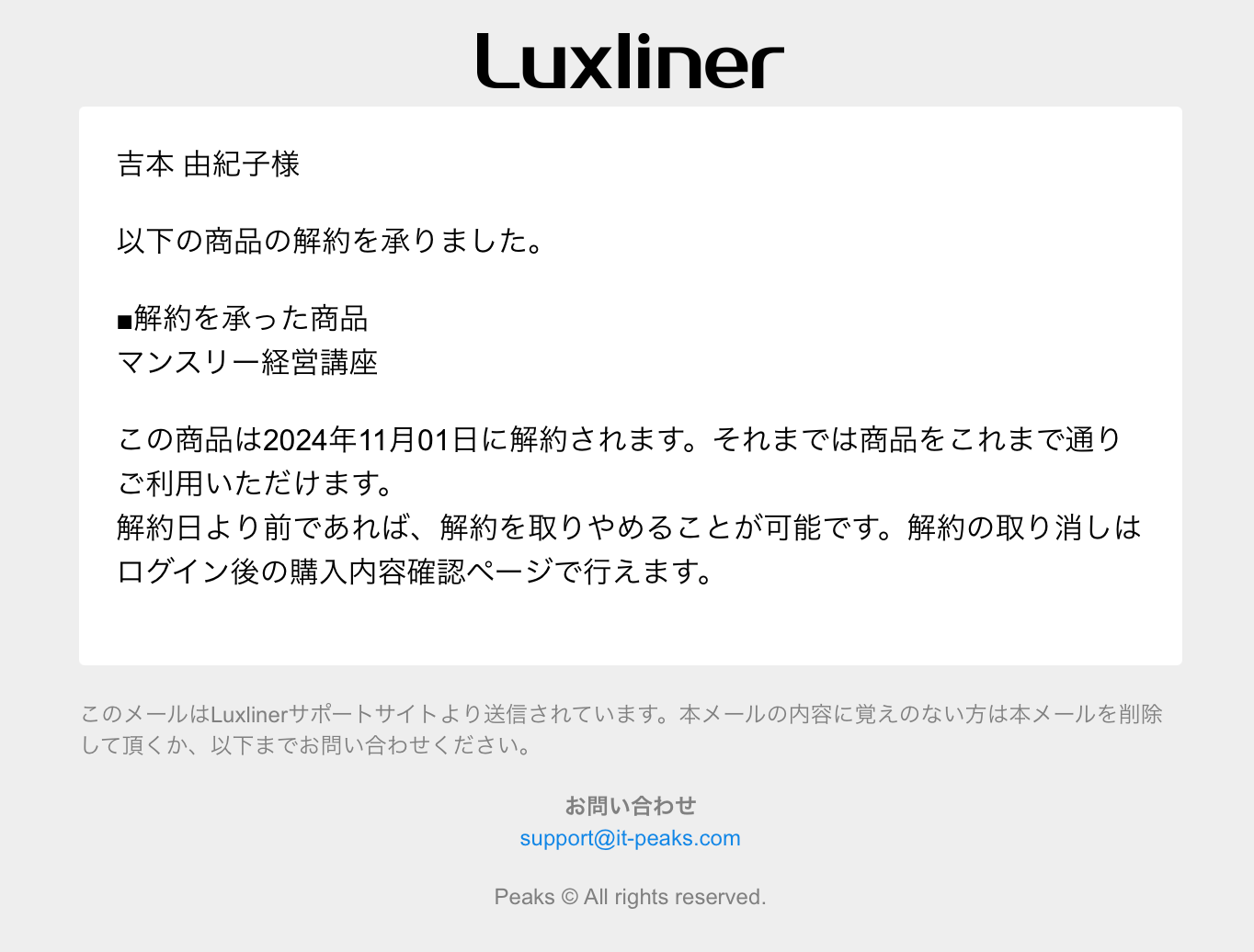 現状、顧客(会員)向けに送信される解約予約メールの本文をカスタマイズすることはできません。
