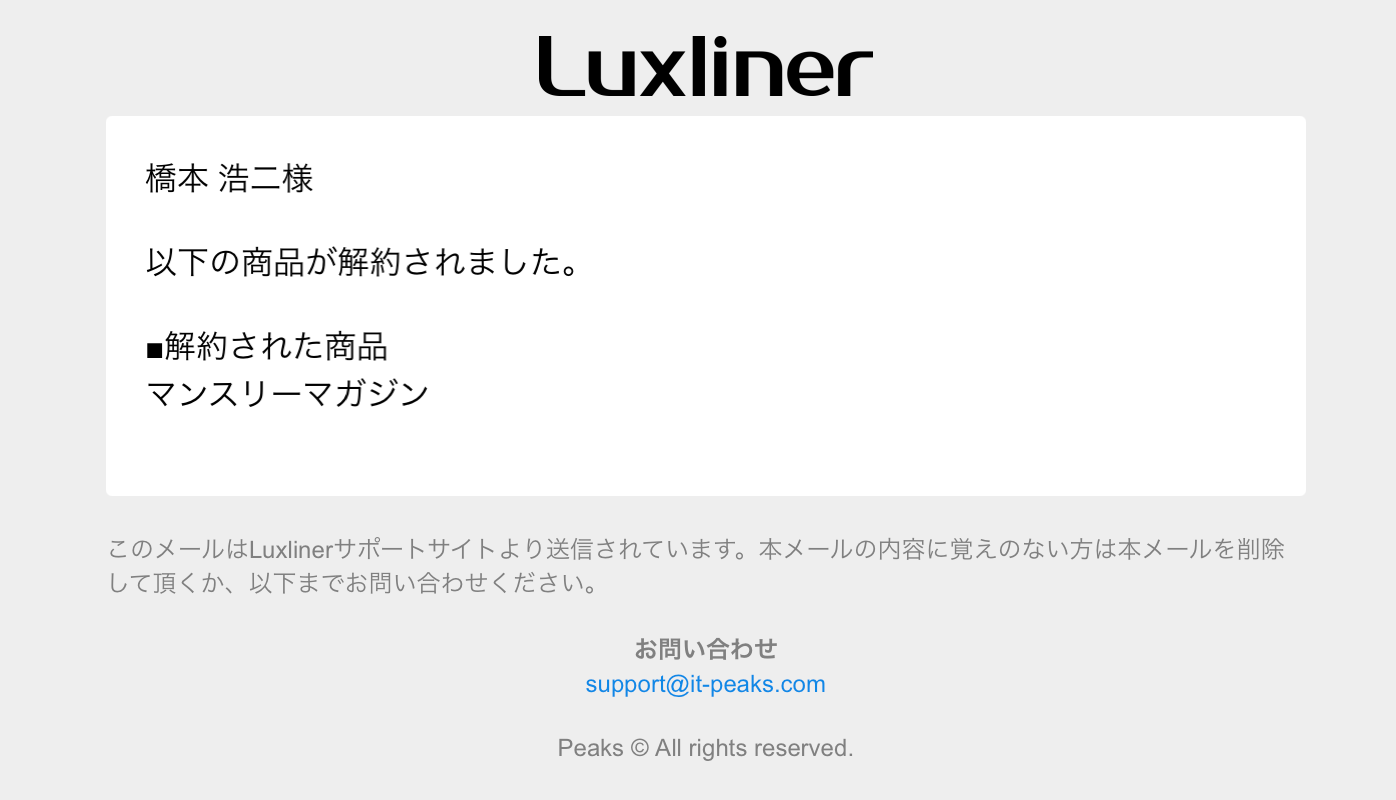 現状、顧客(会員)向けに送信される解約完了メールの本文をカスタマイズすることはできません。