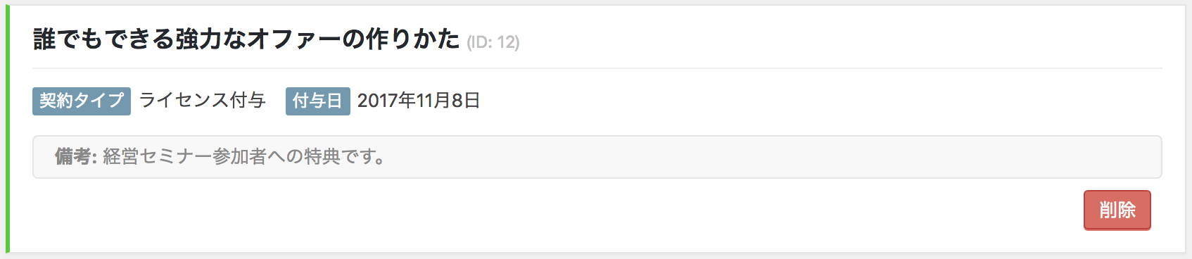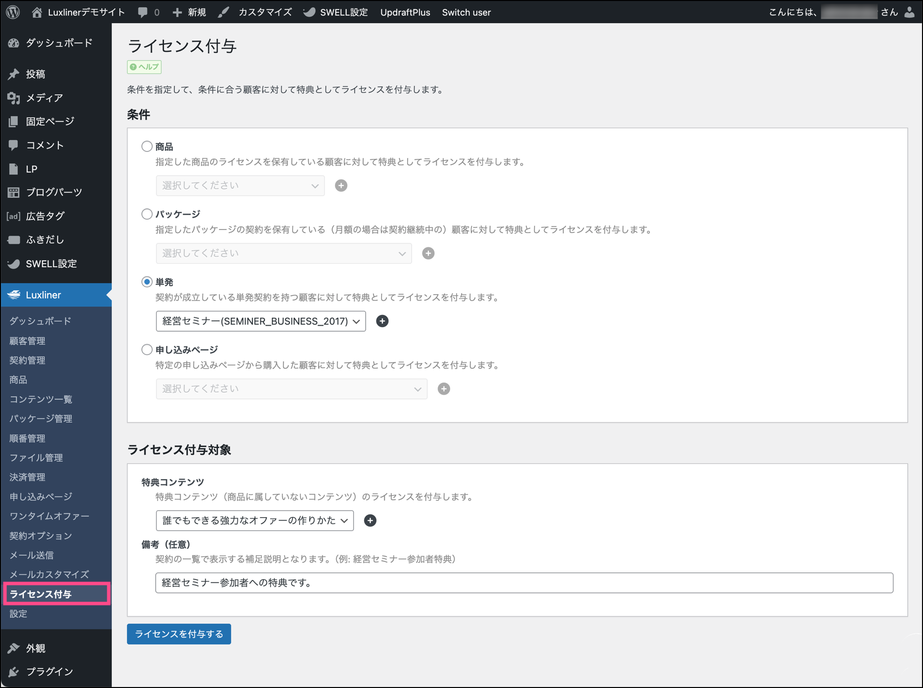 ライセンス付与画面では、指定した条件に合う顧客(会員)に対して、特典コンテンツへのアクセス権(ライセンス)を付与します。