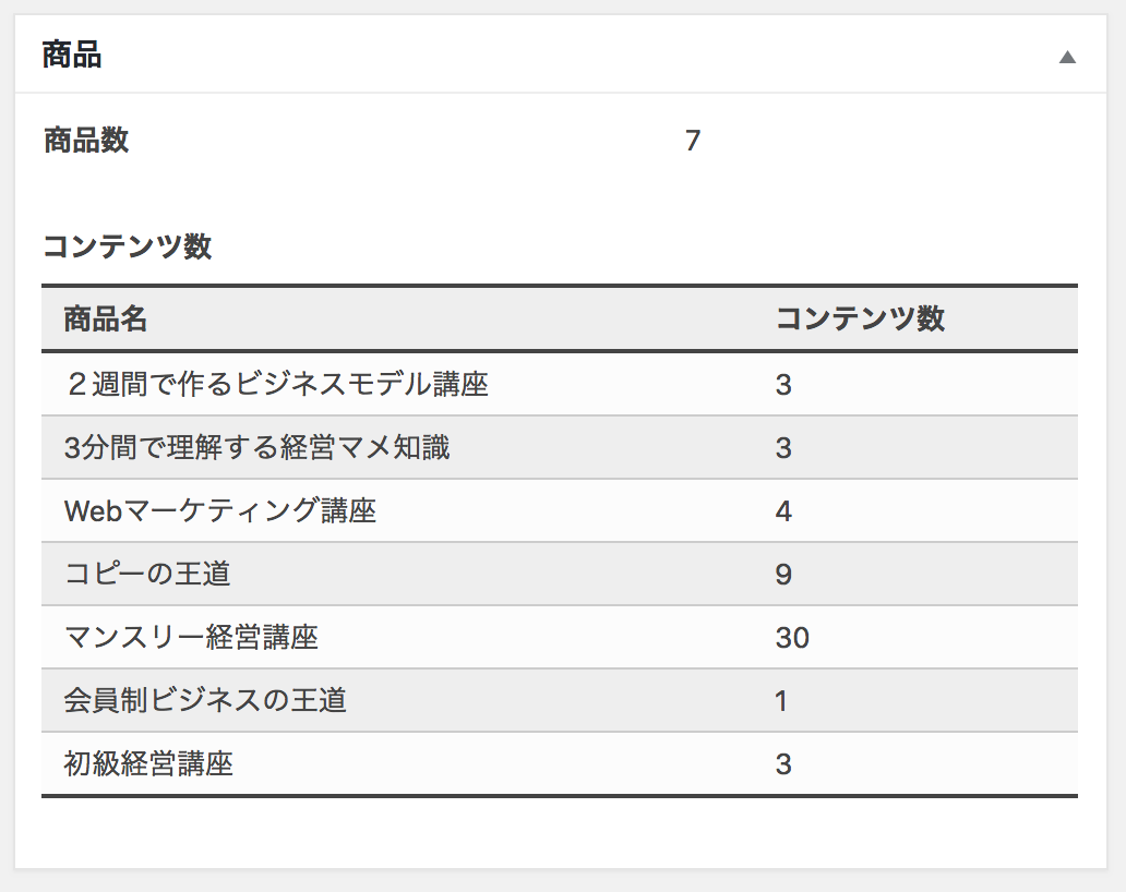 【ダッシュボード】商品 2024 10/14 Luxlinerヘルプ その他 目次ダッシュボード画面 Luxlinerのダッシュボードの、商品ボックスでは、現在会員サイトに作成されている商品の概要を表示しています。 商品数 現在作成済みの商品の総数です。 商品名 商品名です。 コンテンツ数 その商品に属するコンテンツの数です。 Luxlinerヘルプ その他 【ダッシュボード】会員 【ダッシュボード】契約