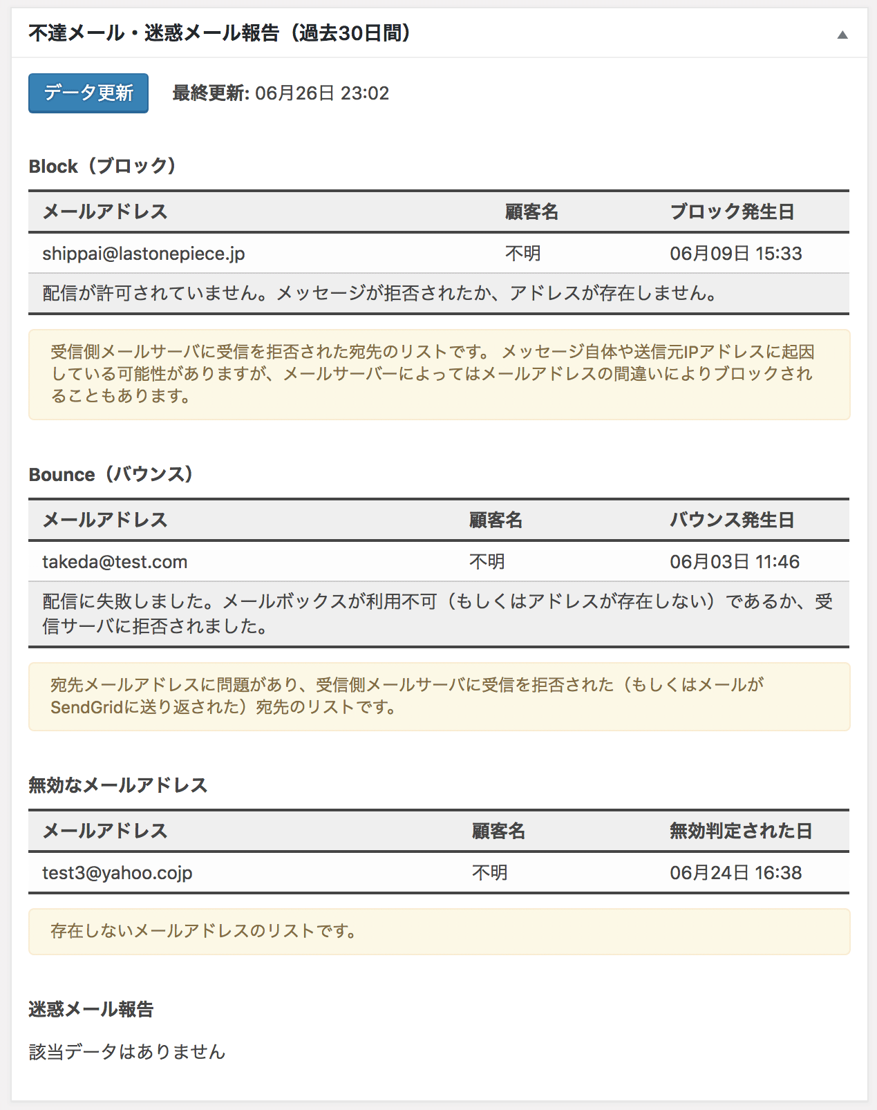 Block(ブロック)やBounce(バウンス)で表示している不達となった理由は、SendGridから知らされるバウンスコードというものをもとに、そのコードの一般的な理由を表示しています。
