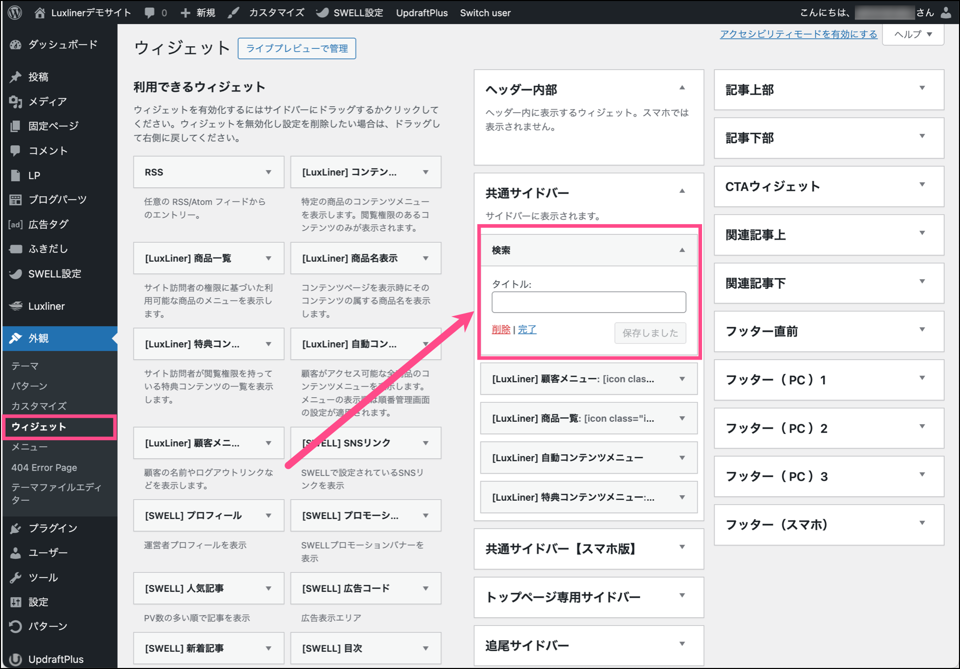 管理画面の外観→ウィジェットをクリックします。