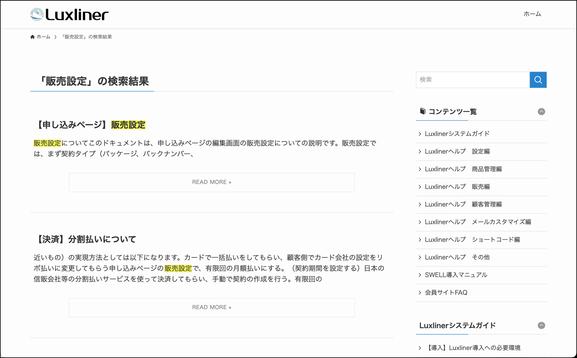 以下の例は、本サポートサイトで「販売設定」というキーワードで検索した結果です。
