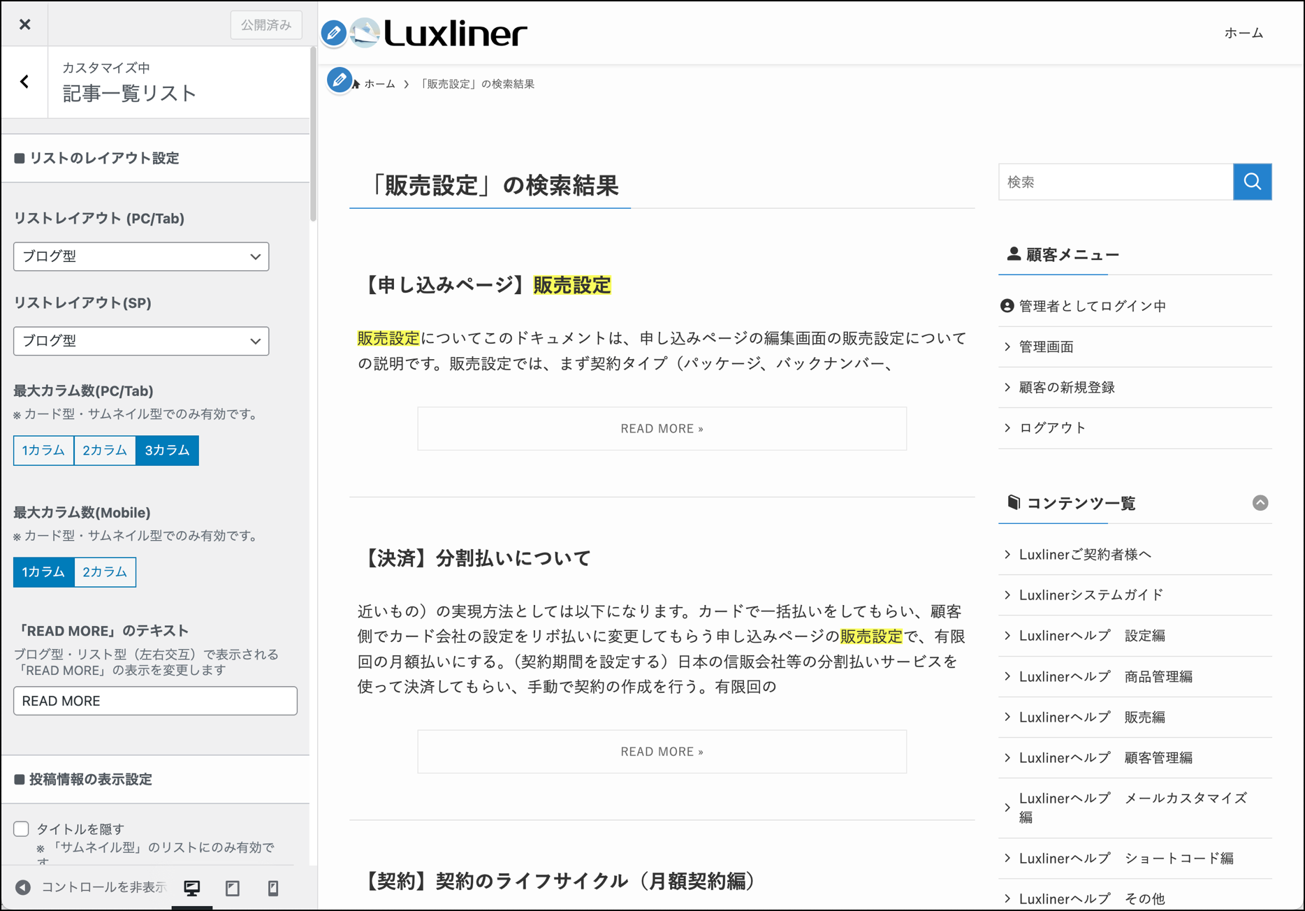 閲覧できるコンテンツは顧客(会員)の商品の購入状況によって変わりますが、Luxlinerのサイト内検索機能では、顧客(会員)が閲覧可能なコンテンツのみが検索結果に表示されます。