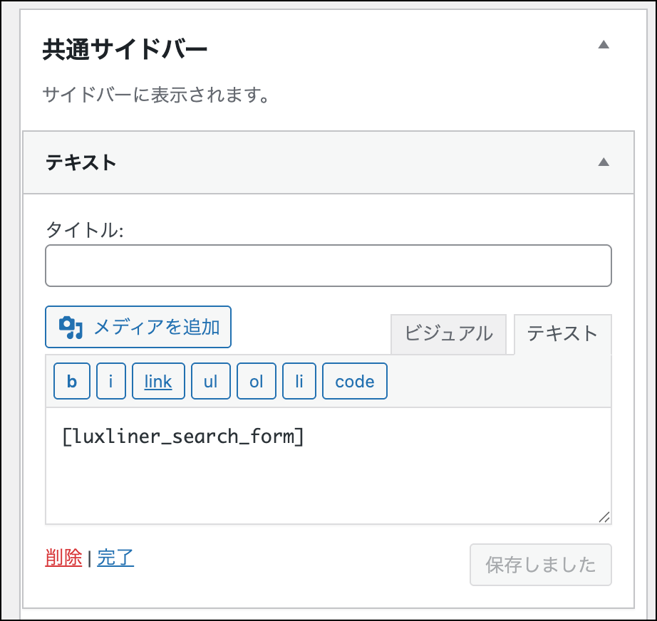 上のように標準の検索バーウィジェットを使う代わりに、テキストウィジェットを配置してLuxlinerで用意している検索バーショートコードを記載することもできます。(検索バーが少し使いやすくなります)
