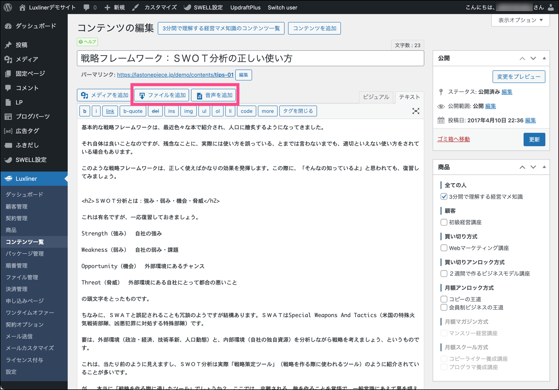 クラシックエディタでは下の編集画面にあるように、Luxlinerによってファイルを追加ボタンと音声を追加ボタンが表示されます。(使用方法は後述)