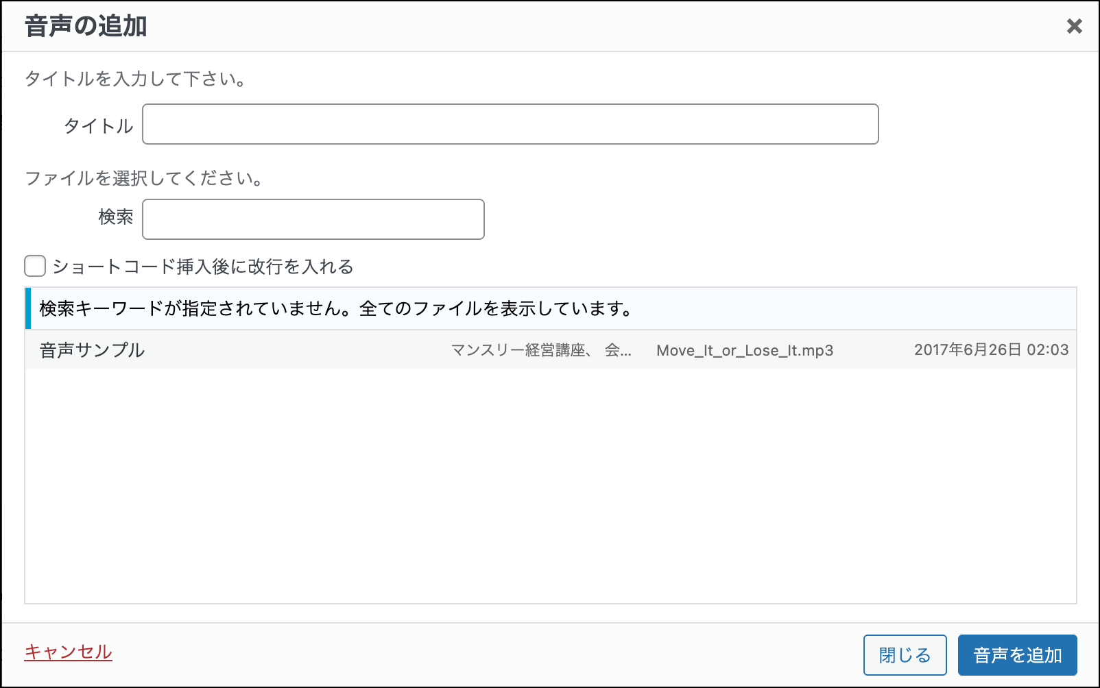 ファイル一覧から挿入したい音声ファイルを選択して音声を追加ボタンを押下するか、ダブルクリックをすると記事の編集テキストエリアにショートコードが挿入されます。(音声プレイヤーのショートコードについてはこちらをご覧ください)