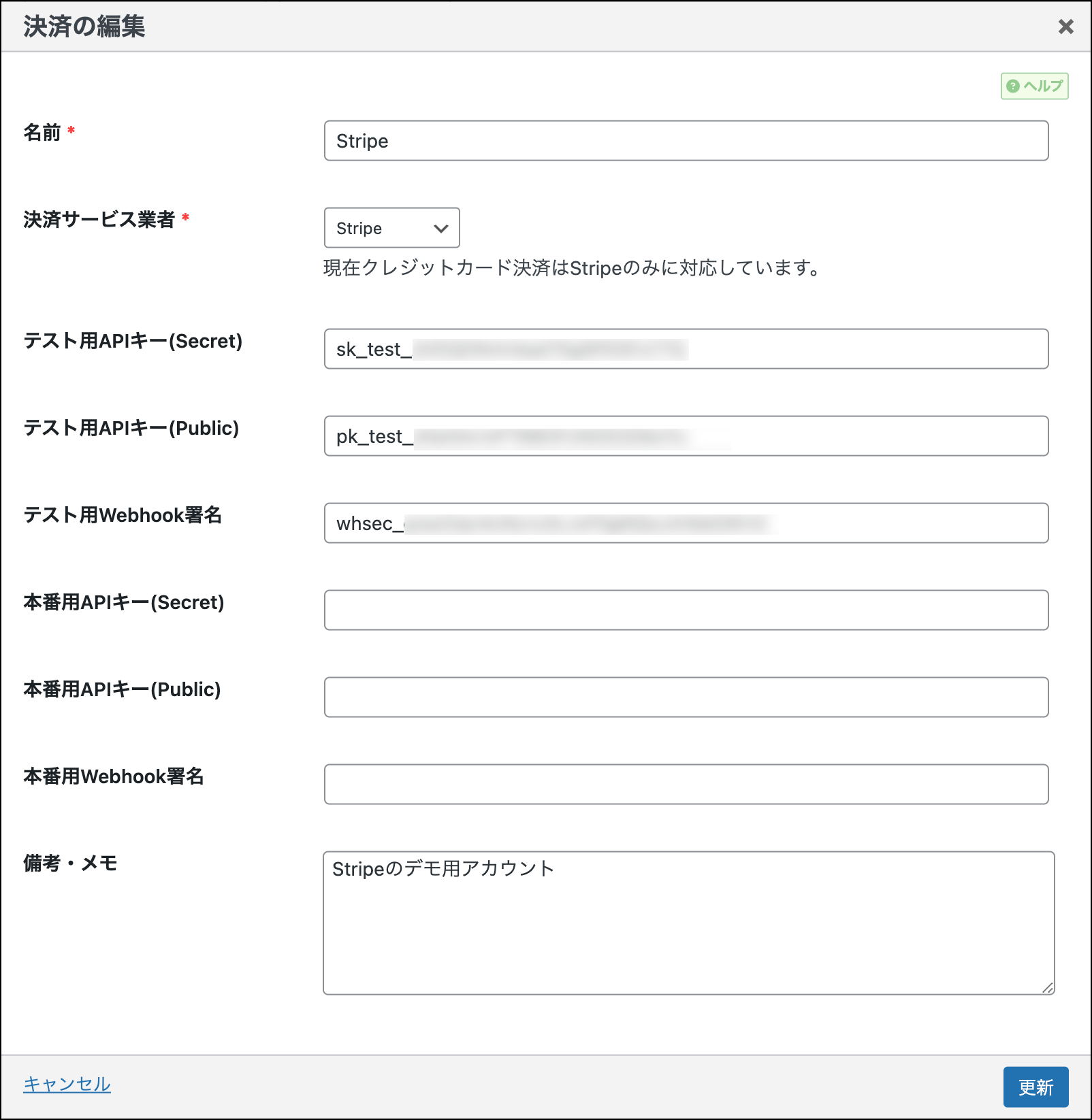 Stripeのwebhook設定を作成した際に発行された本番用のwebhook署名を入力して下さい。whsec_で始まる文字列となります。