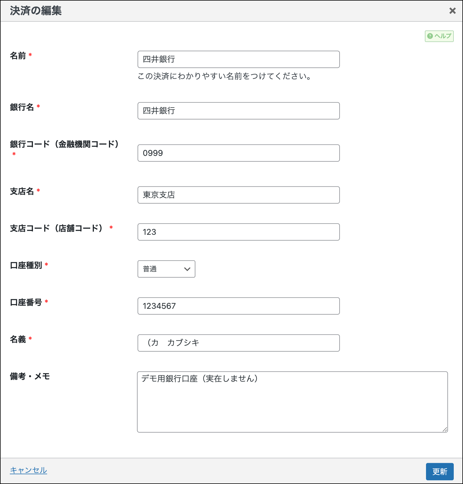 決済方法の作成・編集を行うためのダイアログです。作成の場合も編集の場合も設定項目は同じですが、クレジットカードか銀行振込かで設定内容は変わります。