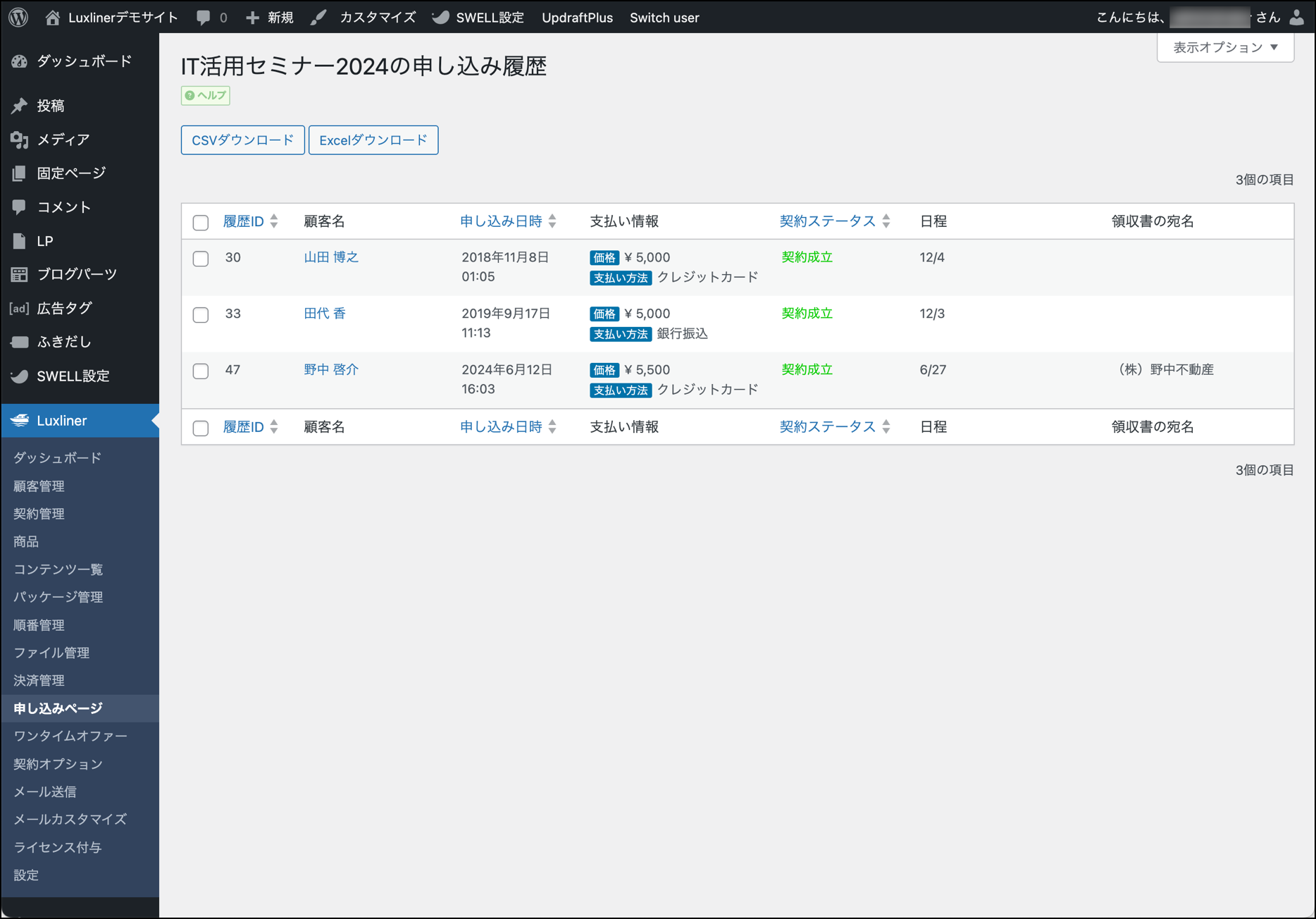 一覧に表示されている内容に加えて、顧客情報(姓・名・メールアドレス・住所など)も付加されたデータがダウンロードできます。セミナー参加者一覧表の作成などに使えます。