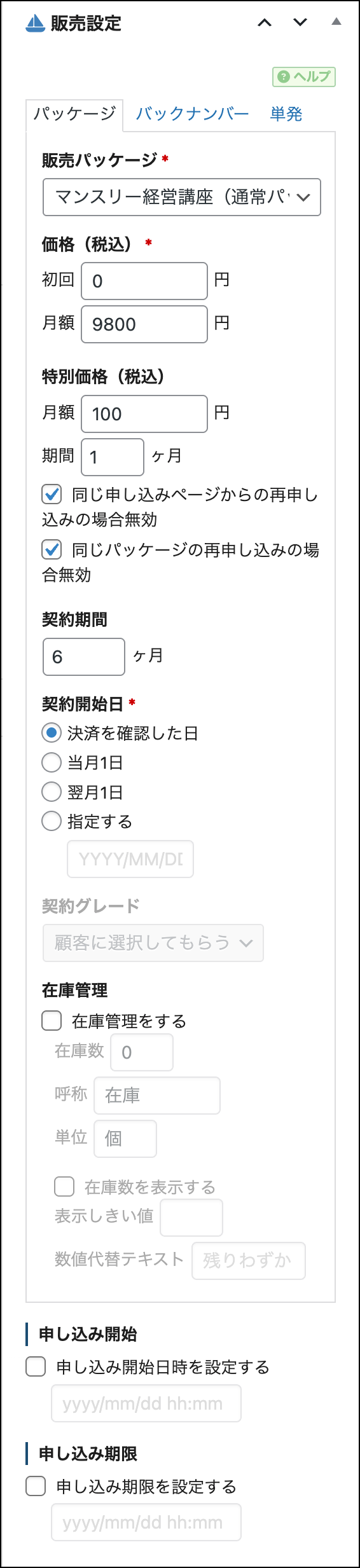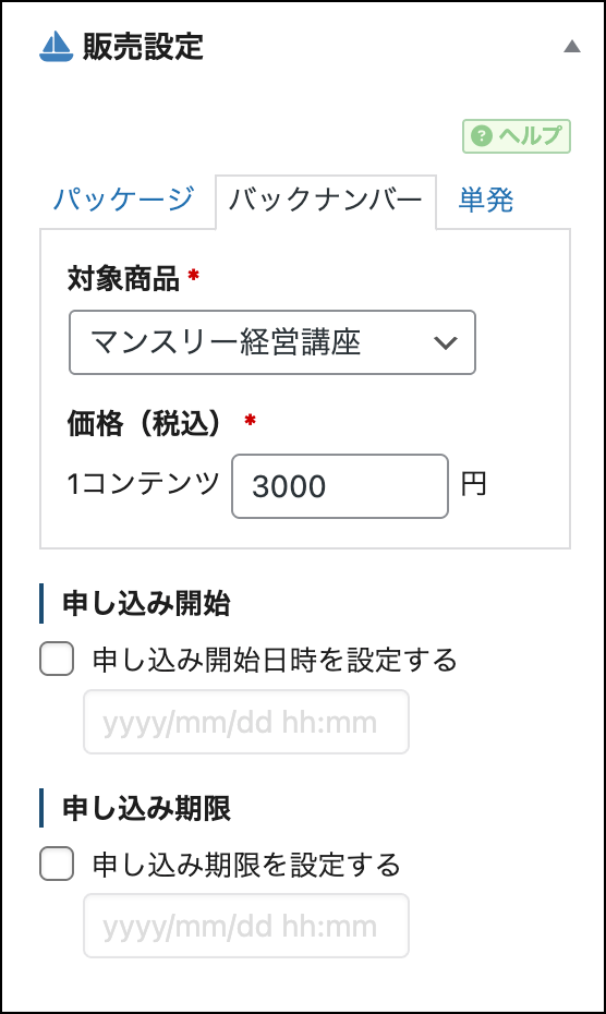 販売設定では、まず契約タイプ(パッケージ、バックナンバー、単発)を選ぶ必要があります。販売する契約タイプをタブから選びます。