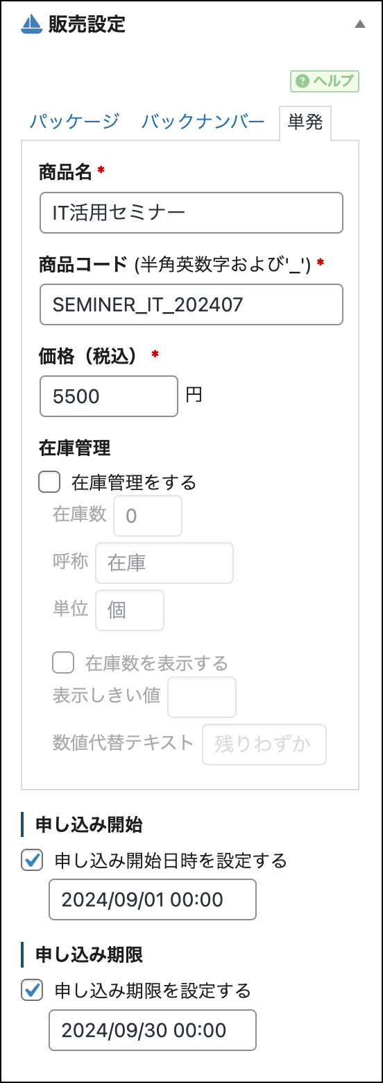在庫管理はパッケージの販売数を制限したり、セミナーの席数などを管理したい場合に使います。