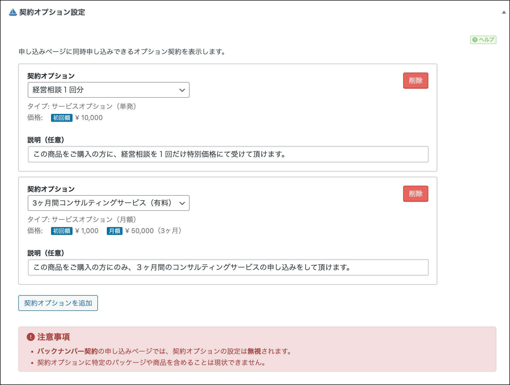 このボタンを押すことで、申し込みページに契約オプションを追加することができます。追加したら、以下の項目を設定して下さい。