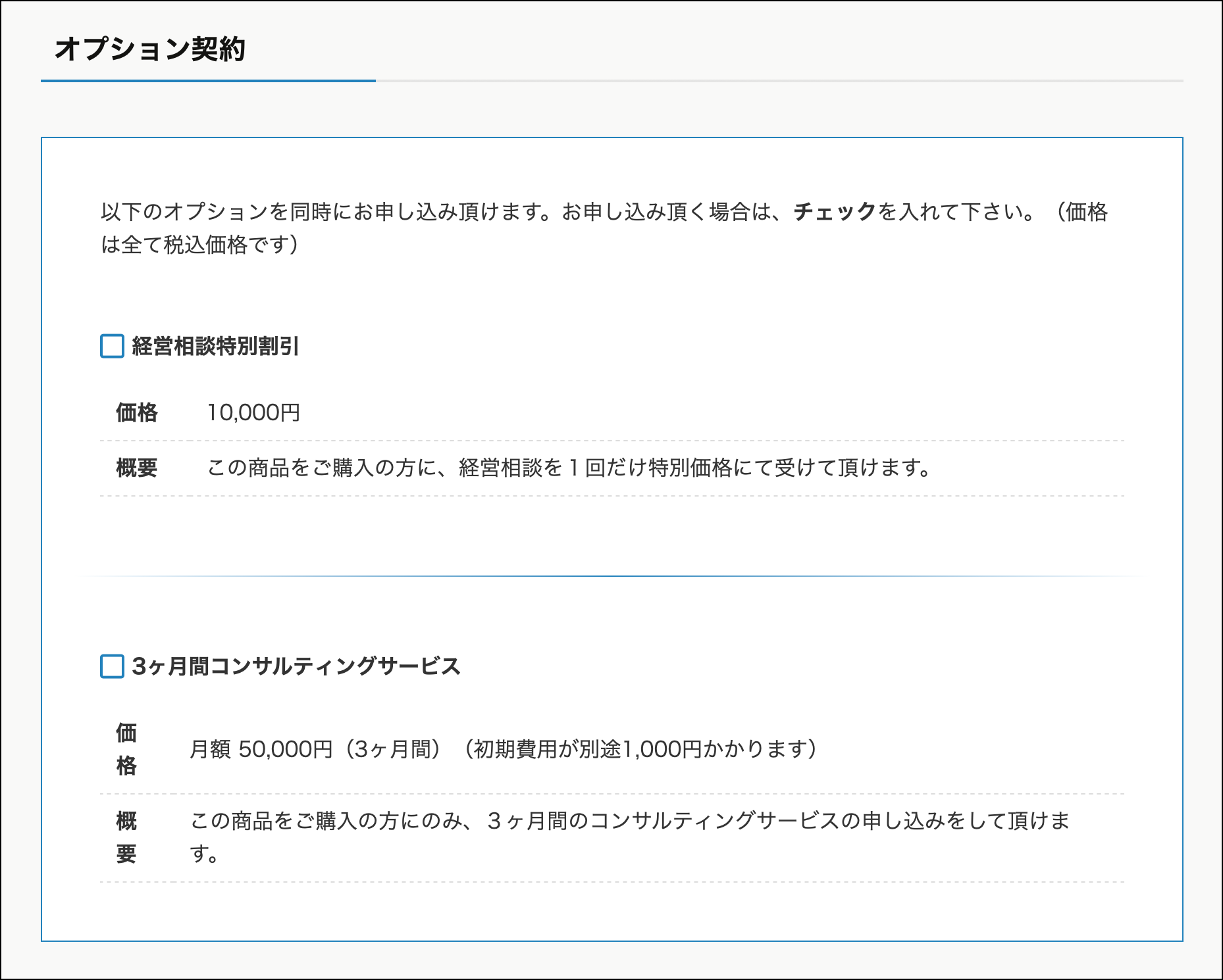 申し込みページにおいて、この契約オプションに関する説明文を表示します。説明の表記は任意ですが、基本的に説明文を用意することをお勧めします。