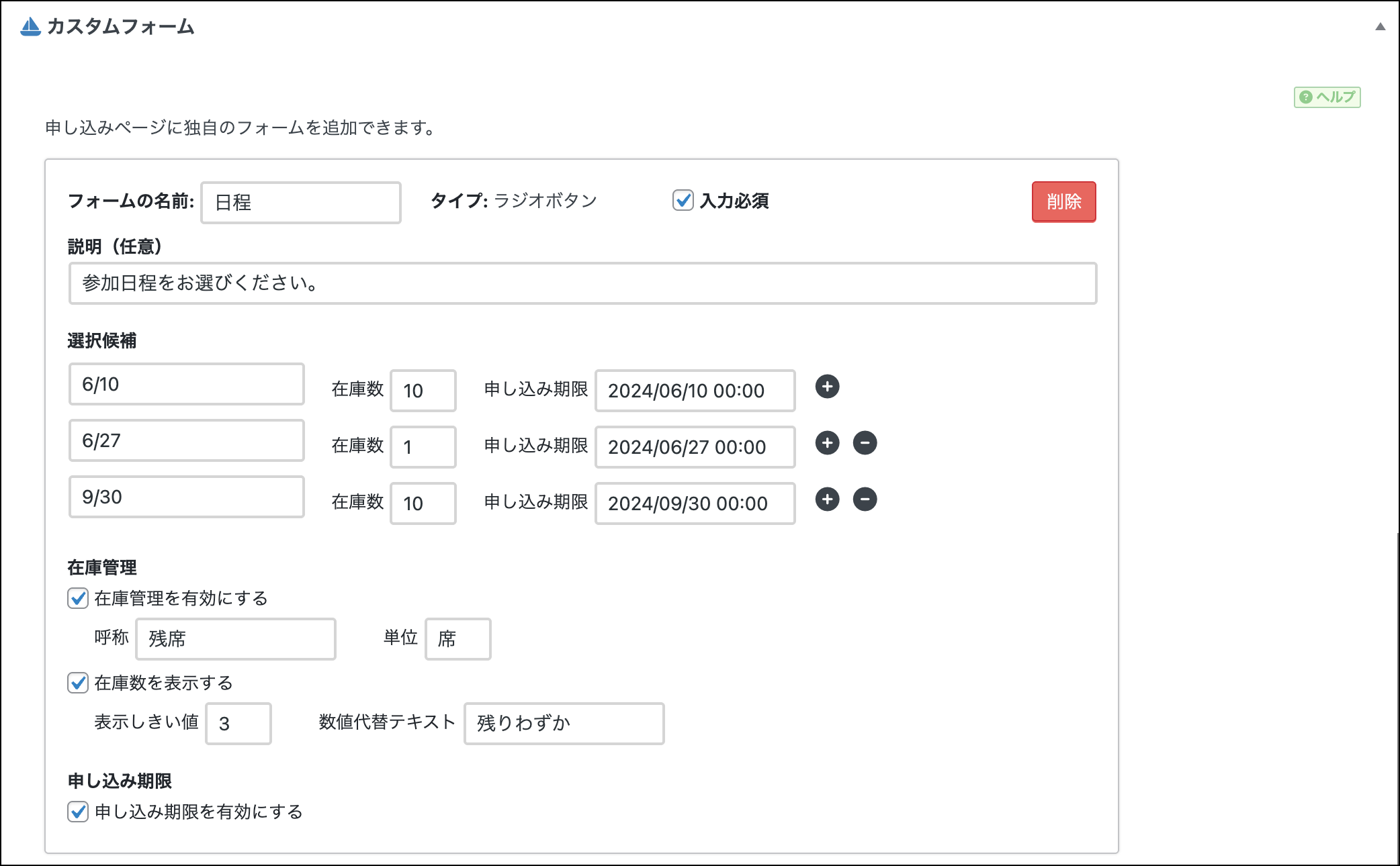 申し込みページで申し込み期限を有効にできるカスタムフォームは1つだけです。