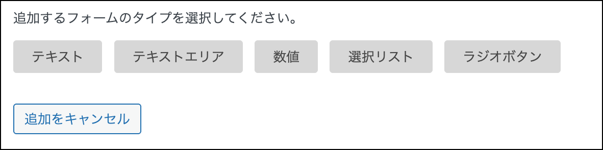カスタムフォームを使う場合はボックス内のカスタムフォームを追加ボタンを押すと、以下のように各タイプのフォームを追加するためのボタンが表示されます。