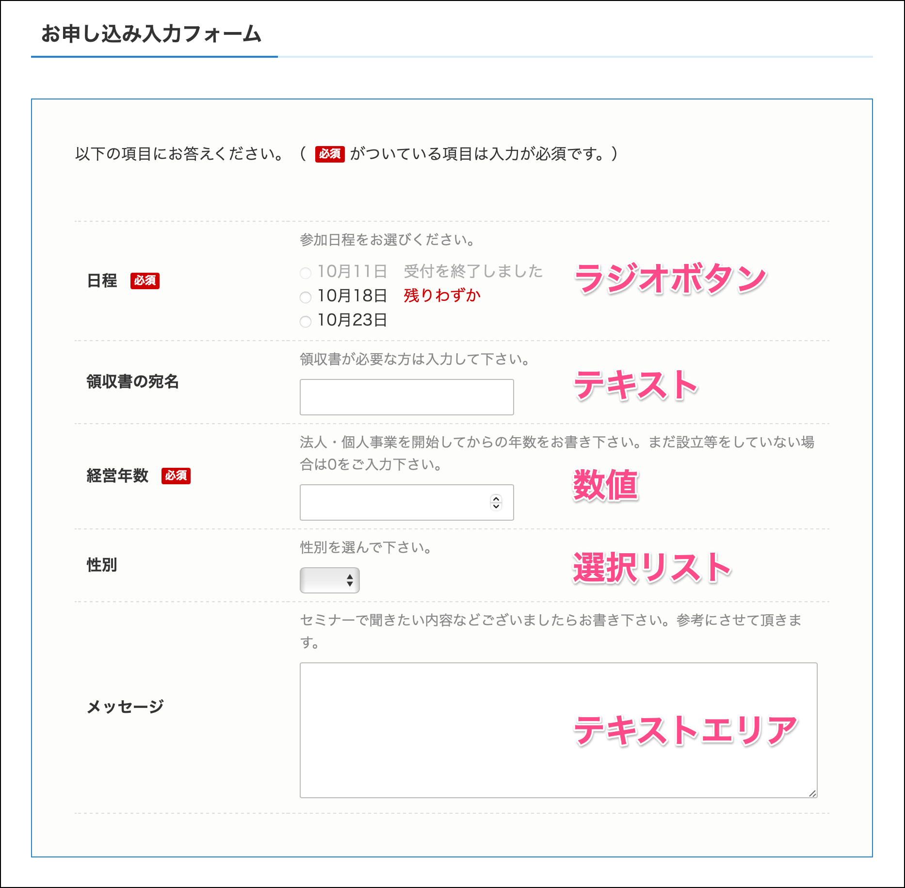 上図のように、テキスト、テキストエリア、数値、選択リスト、ラジオボタンの5つのフォームが作成できます。これらを使うと、以下のようなカスタムフォームが作成できます。