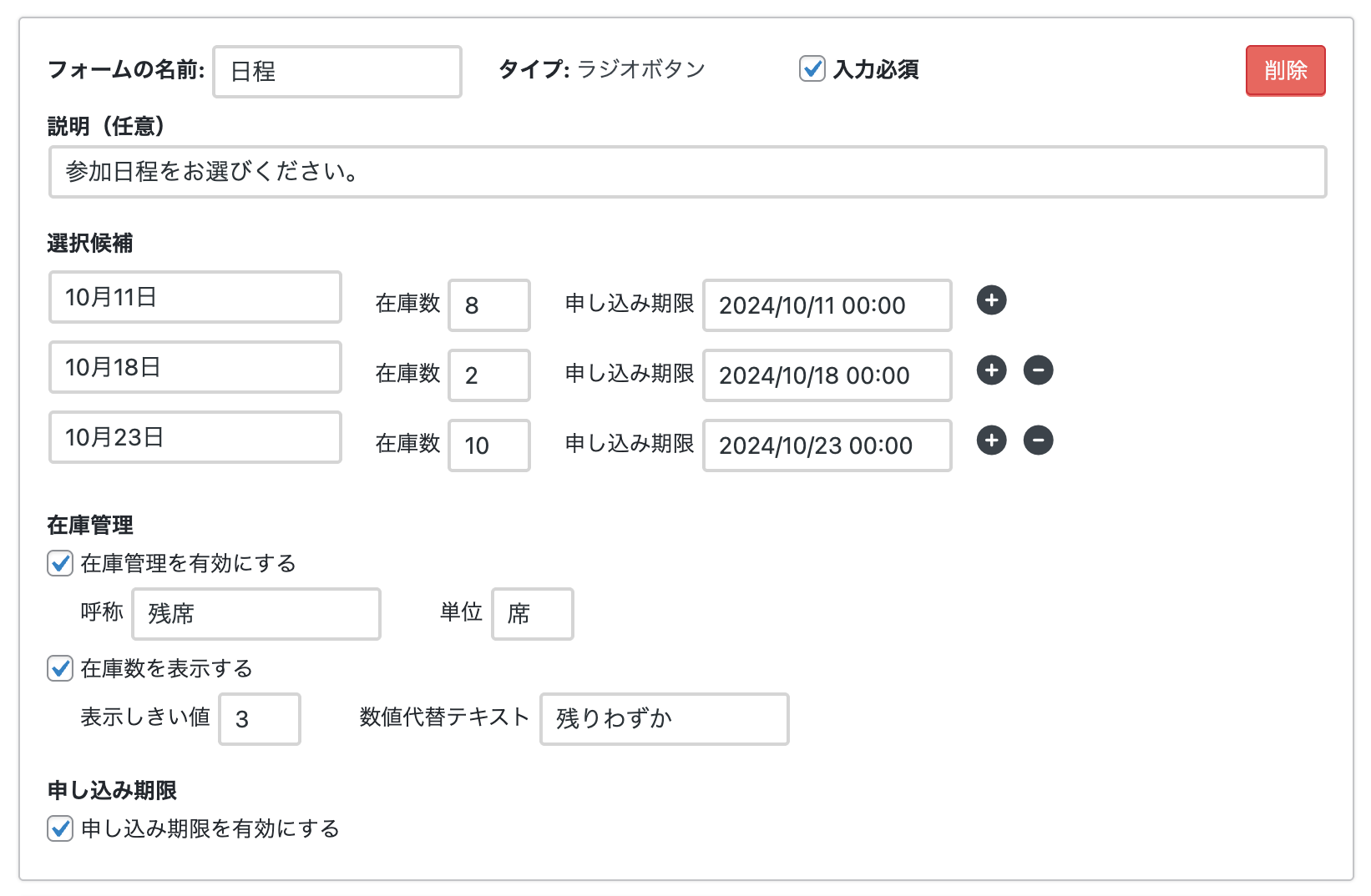 有効にすると、各選択肢ごとに申し込み期限を設定することができます。上の例では、各日程のギリギリまで申し込みの受付をしています。