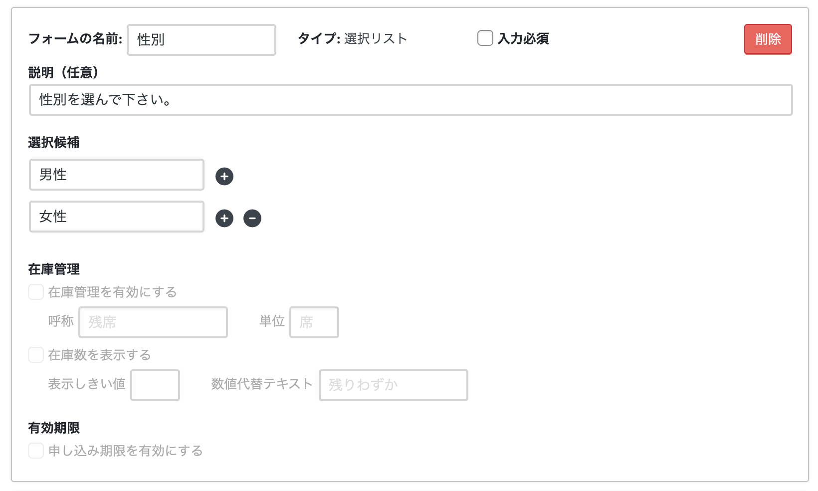 有効にすると、各選択肢ごとに在庫の管理をすることができます。上の例ではセミナーの日程が選択肢となっており、在庫数はそれぞれの日程の残りの席数となっています。