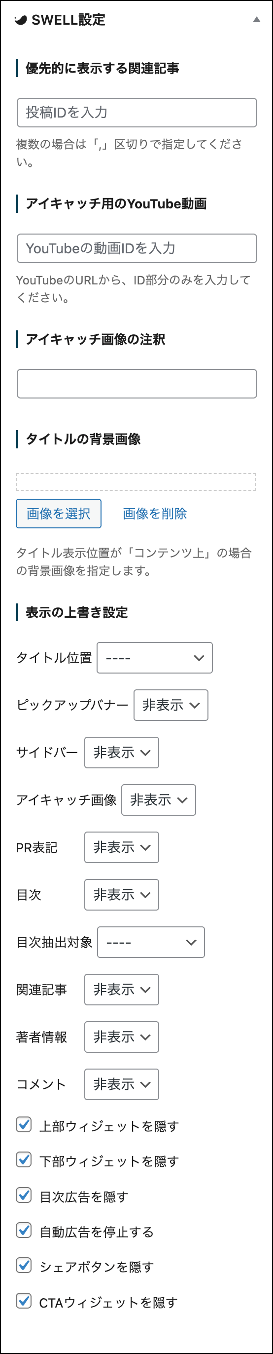 SWELLの場合、編集画面の右サイドバーに左図のような設定が表示されます。