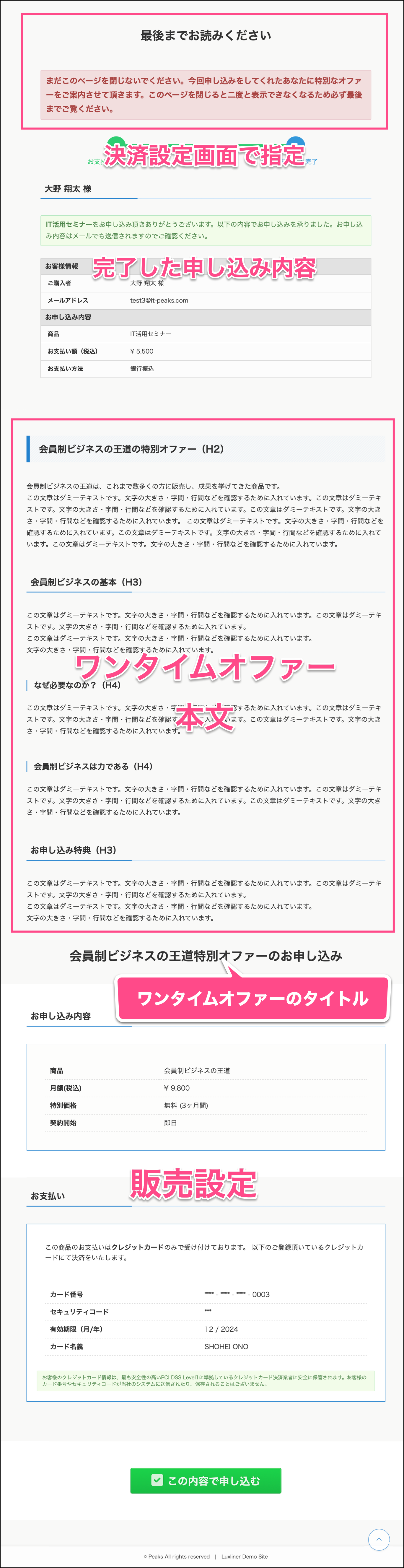 上図の最初の「最後までお読み下さい」とその下の赤枠内のメッセージは、ワンタイムオファーの編集画面ではなく、決済・申込み設定が反映されます。全てのワンタイムオファーで同じタイトルとメッセージが表示されます。