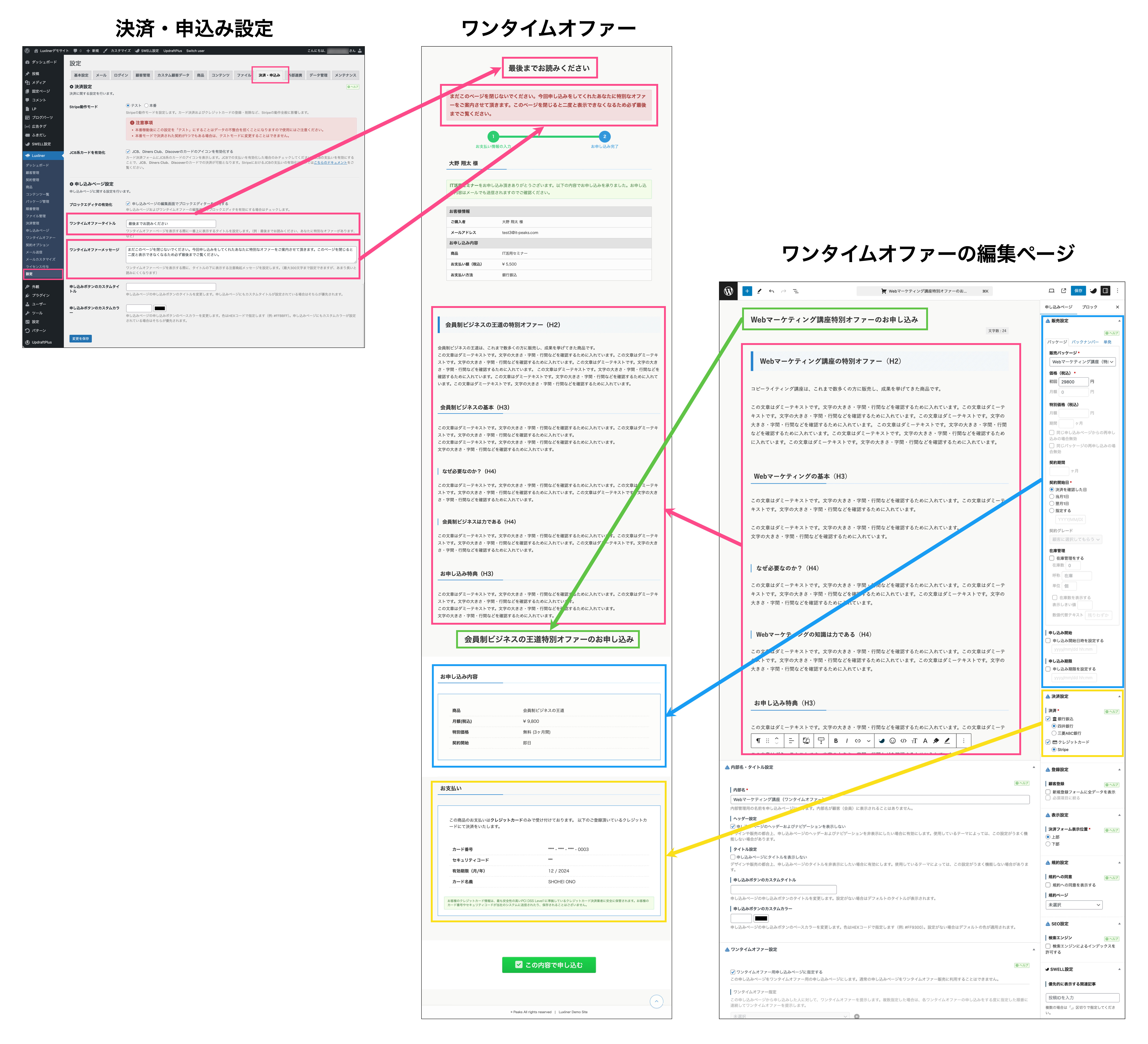 - 申し込みページごとにワンタイムオファーの設定を行えます。